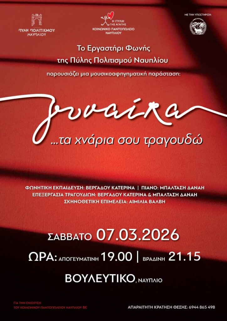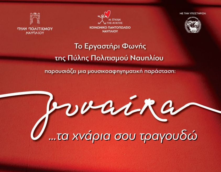 Για την Διεθνή Ημέρα της Γυναίκας το Πολυφωνικό Σύνολο του Εργαστηρίου Φωνής της Πύλης Πολιτισμού Ναυπλίου, παρουσιάζει τη Μουσικο – Αφηγηματική Παράσταση «Γυναίκα …… τα Χνάρια σου Τραγουδώ» Σάββατο 7 Μαρτίου στις 19.00 απογευματινή και στις 21.15 βραδινή στο Βουλευτικό.