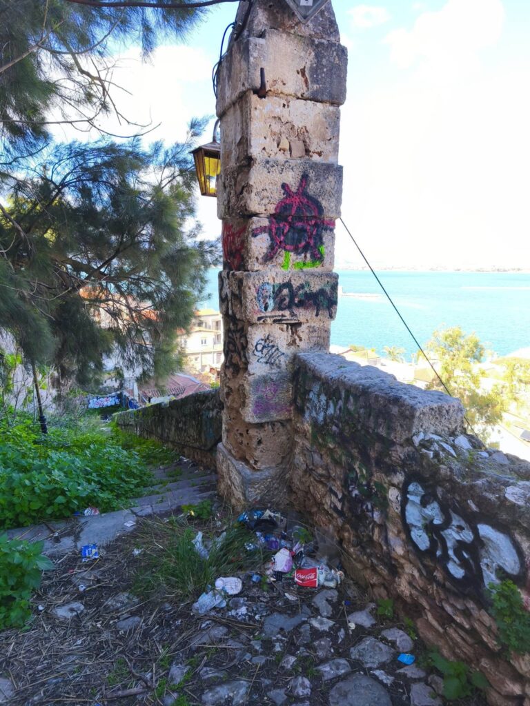 Στην πραγματικότητα, η Πύλη όχι μόνο είναι κλειδωμένη με λουκέτο αλλά και ο περιβάλλων χώρος είναι άκρως ακατάλληλος και επικίνδυνος για επισκέψεις. Παντού σκουπίδια και αγριόχορτα, ετοιμόρροποι τοίχοι μέχρι και σπασμένος φωτιστικός στύλος πεσμένος στα σκαλιά συνθέτουν το σκηνικό.