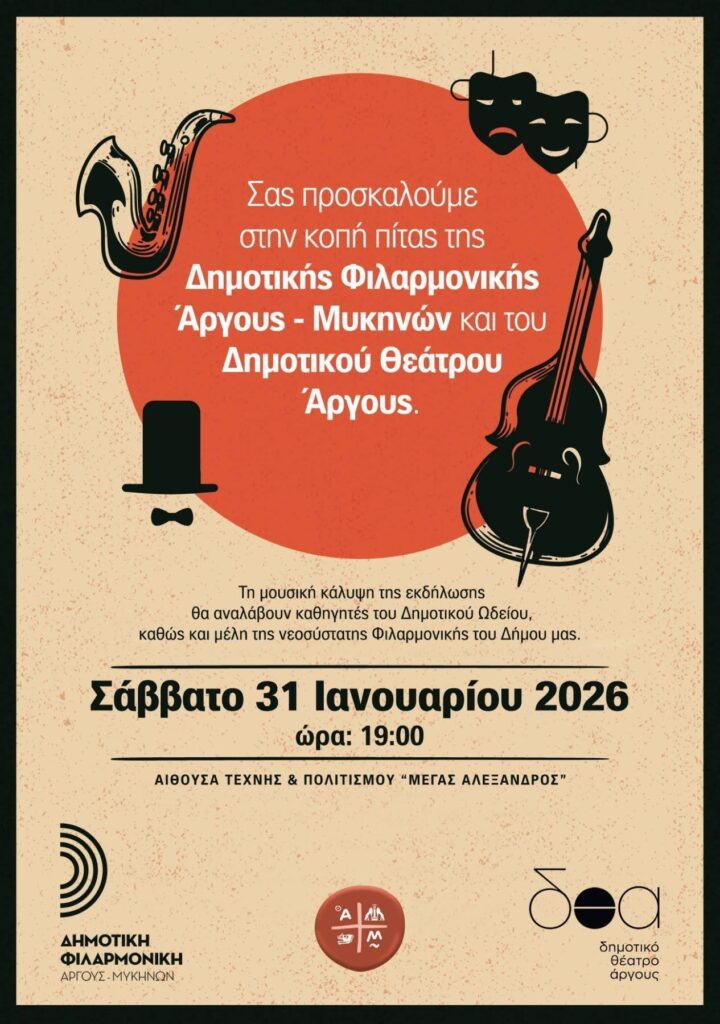 Το Δημοτικό Θέατρο Άργους μαζί με τη Δημοτική Φιλαρμονική κόβουν σήμερα την Πρωτοχρονιάτικη πίτα τους, ώρα 19:00 το απόγευμα στην αίθουσα «Μέγας Αλέξανδρος».