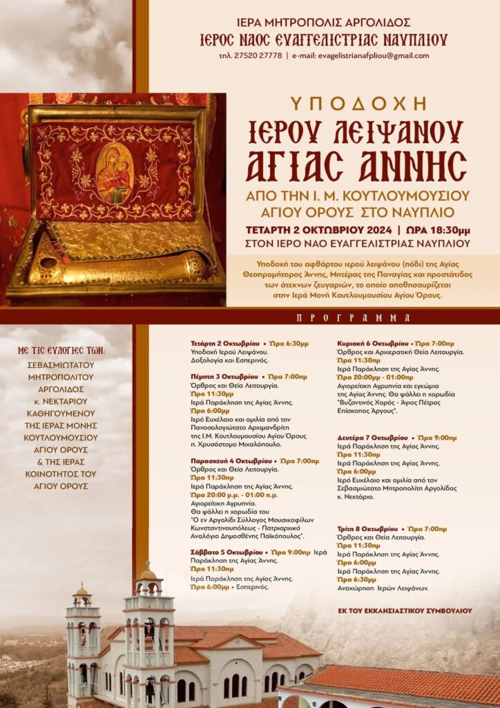 Μία πολύ μεγάλη ευκαιρία και ιδιαίτερα για τις γυναίκες, που δεν μπορούν να επισκεφτούν το Άγιο Όρος, να έρθουν, να προσκυνήσουν το Ιερό Λείψανο της Αγίας Άννας, την Τετάρτη 2 Οκτωβρίου 2024 και ώρα 18:30 μ.μ., στον Ιερό Ναό «ΕΥΑΓΓΕΛΙΣΤΡΙΑΣ» Ναυπλίου.