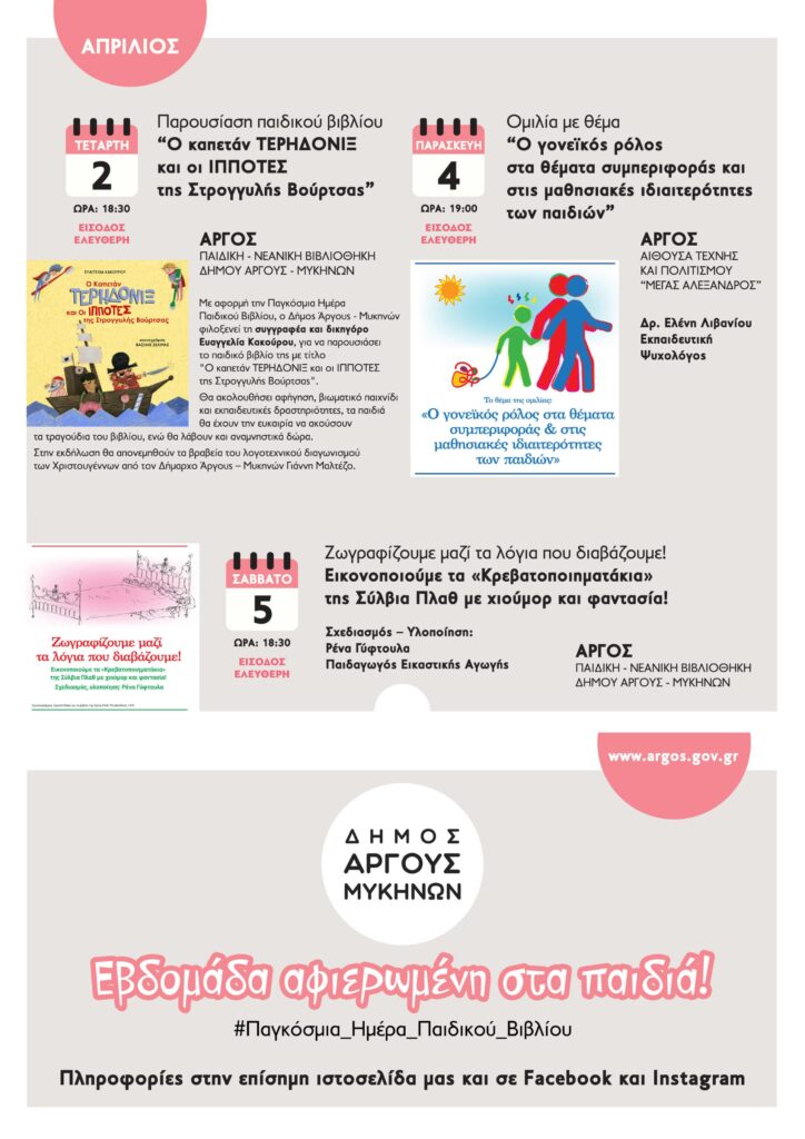 Ο Δήμος Άργους – Μυκηνών, με αφορμή την Παγκόσμια Ημέρα Παιδικού Βιβλίου, διοργανώνει τρεις δημιουργικές και εκπαιδευτικές εκδηλώσεις την πρώτη εβδομάδα του Απριλίου.