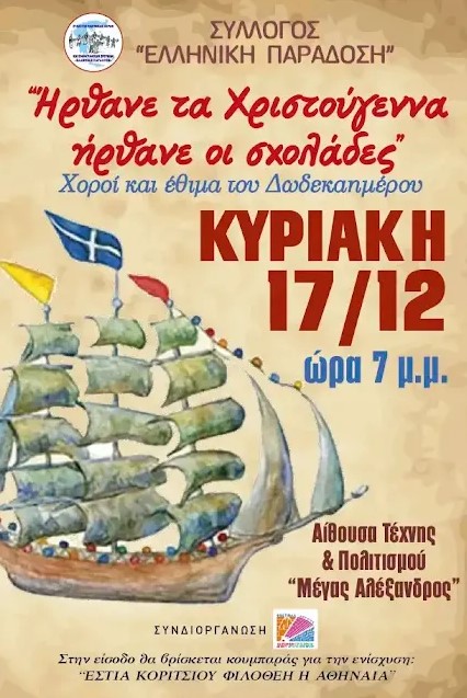 Η φετινή, καθιερωμένη, χριστουγεννιάτικη εκδήλωση του Συλλόγου «Ελληνική Παράδοση», έχει προγραμματισθεί για την Κυριακή 17 Δεκεμβρίου, στις 7.00 το απόγευμα, στην αίθουσα εκδηλώσεων Μέγας Αλέξανδρος, στο Άργος και έχει τίτλο: «Ήρθανε τα Χριστούγεννα ήρθανε οι σχολάδες», με χορούς και έθιμα του Δωδεκαημέρου.