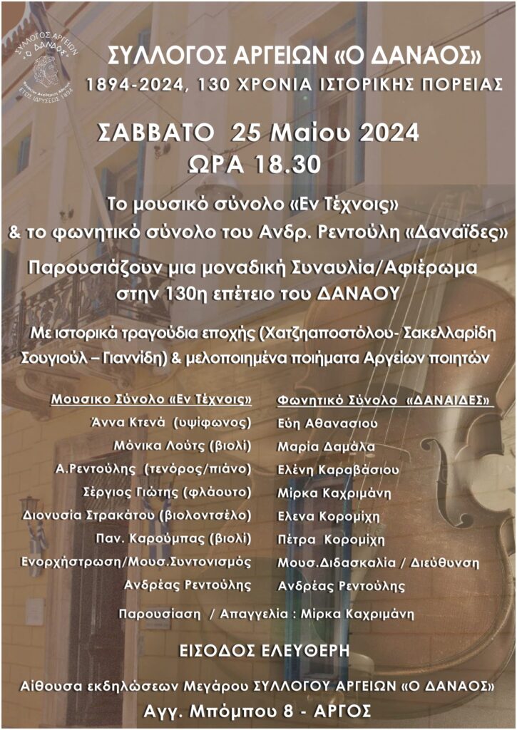 Με μια καταπληκτική συναυλία / αφιέρωμα στην 130η επέτειο του ΔΑΝΑΟΥ, από το μουσικό σύνολο «Εν Τέχνοις» & το φωνητικό σύνολο του Ανδρ. Ρεντούλη «Δαναϊδες», έκλεισε το Σάββατο 25 Μαΐου στην αίθουσα εκδηλώσεων του Συλλόγου μας, η 1η περίοδος των εφετεινών εκδηλώσεών μας.
