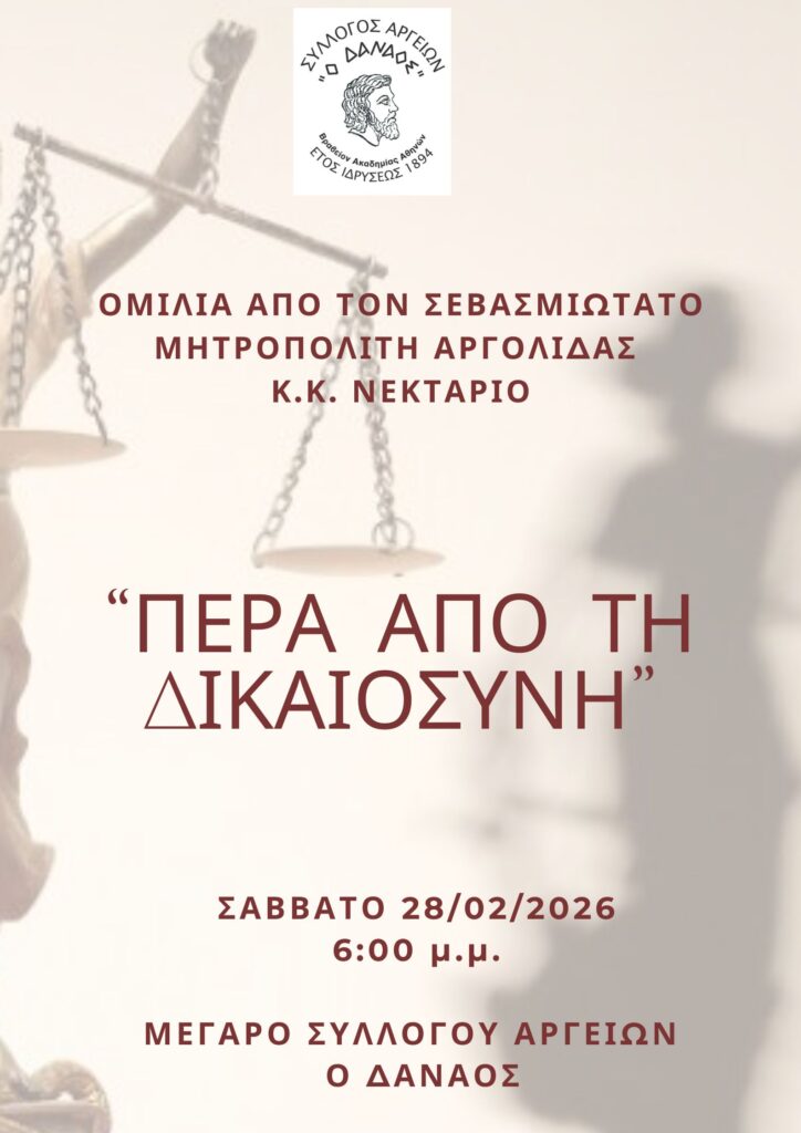Ο Σύλλογος Αργείων «Ο Δαναός» έχει την τιμή και τη χαρά να σας προσκαλέσει στην ομιλία του Σεβασμιωτάτου Μητροπολίτη Αργολίδας, κ.κ. Νεκταρίου, με θέμα «Πέρα από τη δικαιοσύνη», που θα πραγματοποιηθεί στο Μέγαρο του Συλλόγου Αργείων «Ο Δαναός», το Σάββατο 28 Φεβρουαρίου 2026 και ώρα 6:00 μ.μ.