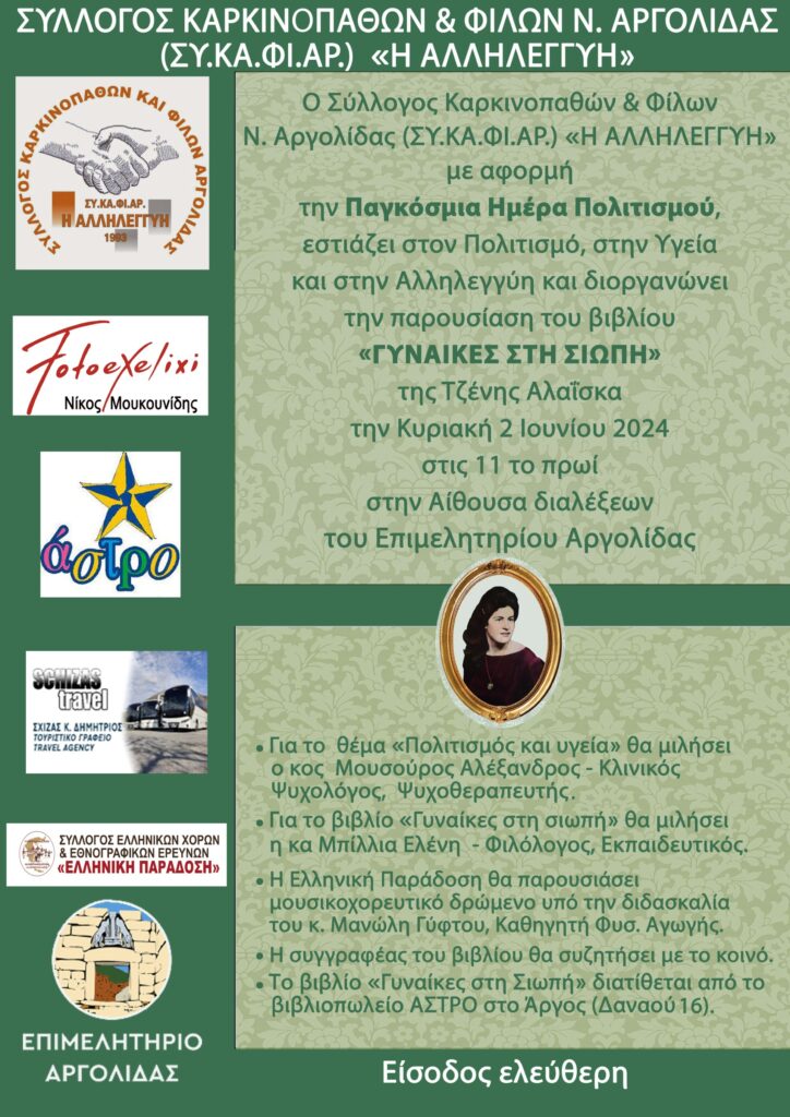 Ο Σύλλογος Καρκινοπαθών & Φίλων Ν. Αργολίδας (ΣΥ.ΚΑ.ΦΙ.ΑΡ.) «Η ΑΛΛΗΛΕΓΓΥΗ», με αφορμή την Παγκόσμια Ημέρα Πολιτισμού, εστιάζει στον Πολιτισμό, στην Υγεία και στην Αλληλεγγύη και διοργανώνει την παρουσίαση του βιβλίου «ΓΥΝΑΙΚΕΣ ΣΤΗ ΣΙΩΠΗ» της Τζένης Αλαΐσκα, την Κυριακή 2 Ιουνίου 2024 στις 11 το πρωί στην αίθουσα διαλέξεων του Επιμελητηρίου Αργολίδας.