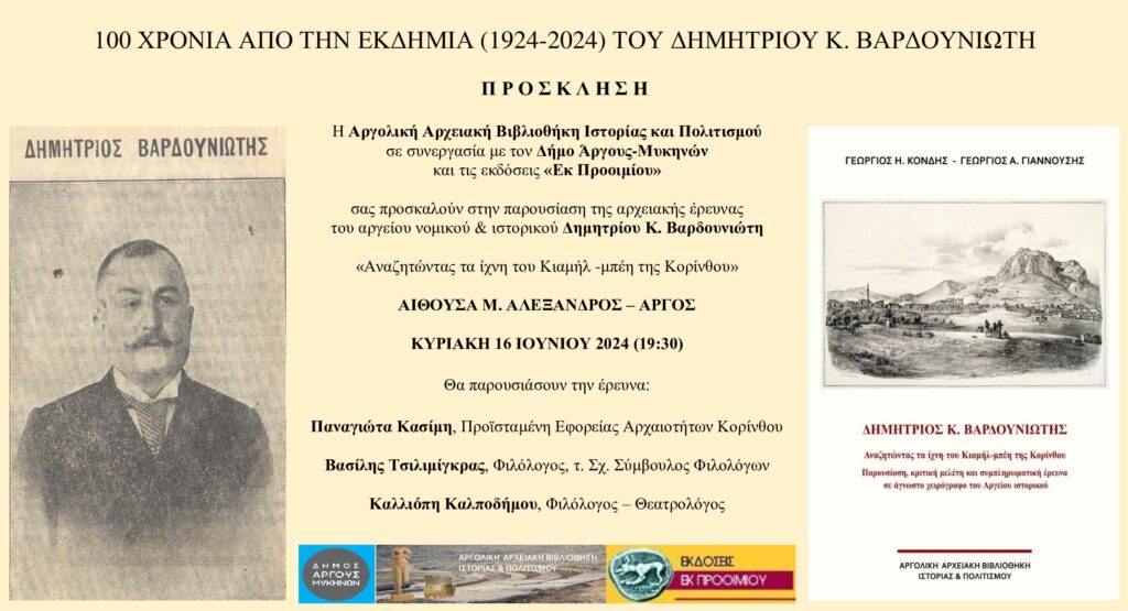 Την Κυριακή 16 Ιουνίου, στις 7.30 το βράδυ, στην αίθουσα «Μέγας Αλέξανδρος», στο Άργος, θα παρουσιαστεί η έρευνα – έκδοση, του Γεωργίου Η. Κόνδη και του Γεωργίου Α. Γιαννούση, με τίτλο: “Δημήτριος Κ. Βαρδουνιώτης: Αναζητώντας τα ίχνη του Κιαμήλ-Μπέη της Κορίνθου”.