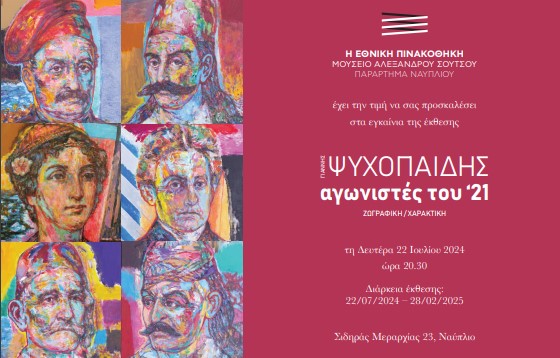 Τη Δευτέρα 22 Ιουλίου 2024, ώρα 20.00 στην Εθνική Πινακοθήκη-Μουσείο Αλεξάνδρου Σούτσου-Παράρτημα Ναυπλίου εγκαινιάζεται η έκθεση ΓΙΑΝΝΗΣ ΨΥΧΟΠΑΙΔΗΣ «Αγωνιστές του ’21»