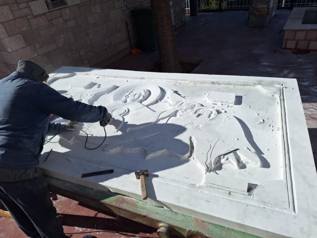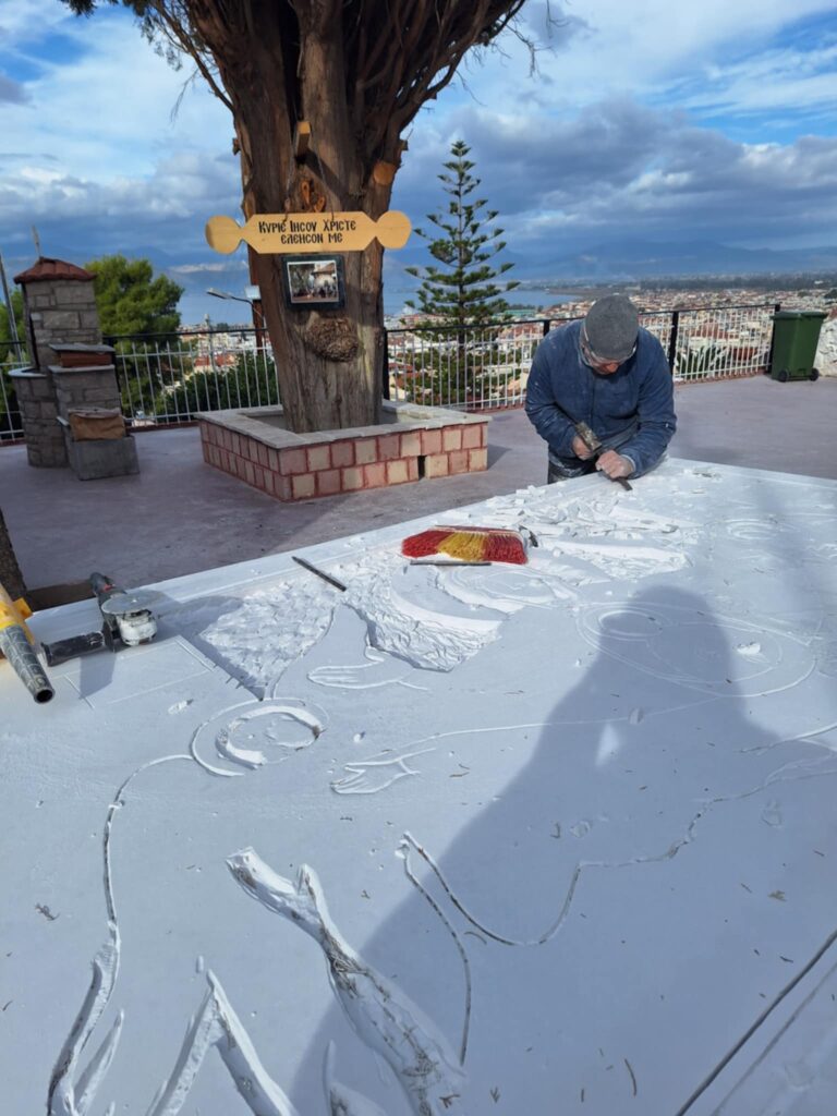 Το γλυπτό φιλοτεχνήθηκε εξ ολοκλήρου αφιλοκερδώς από τον κ. Δημήτριο Μαυρόγιαννη, ο οποίος εργάστηκε καθημερινά με αφοσίωση και απαράμιλλη τέχνη, ώστε να χαράξει στο μάρμαρο αυτή την ιερή σύνθεση. Το αποτέλεσμα είναι ένα αριστούργημα που θα κοσμεί τον Ναό μας και την πόλη μας εις το διηνεκές.