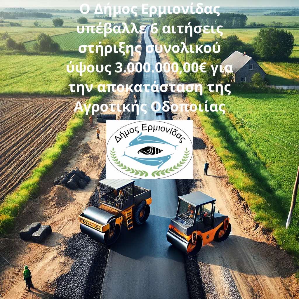 Ο Δήμος Ερμιονίδας υπέβαλλε προς το Υπουργείο Αγροτικής Ανάπτυξης και Τροφίμων,6 ολοκληρωμένες προτάσεις χρηματοδότησης συνολικού ύψους 3.000.000,00€ στα πλαίσια του Προγράμματος Π3-73-1.2 «Βελτίωση πρόσβασης σε γεωργική γη και κτηνοτροφικές εκμεταλλεύσεις» για την αποκατάσταση της Αγροτικής Οδοποιίας, η οποία περιλαμβάνει την ασφαλτόστρωση αγροτικών οδών σε Δημοτικές Κοινότητες του Δήμου Ερμιονίδας με στόχο την ευκολότερη, την ταχύτερη και ασφαλέστερη μεταφορά των ευπαθών προϊόντων.