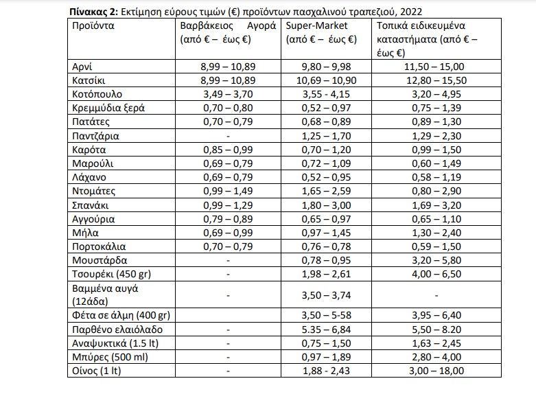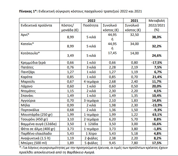 Θα πρέπει να ληφθεί υπόψιν ότι η εκτίμηση του κόστους για το πασχαλινό τραπέζι του 2022 επιχειρείται εν μέσω ενός ιδιαίτερα ρευστού πλαισίου, καθώς οι μεταβολές των τιμών είναι πολύ συχνές.