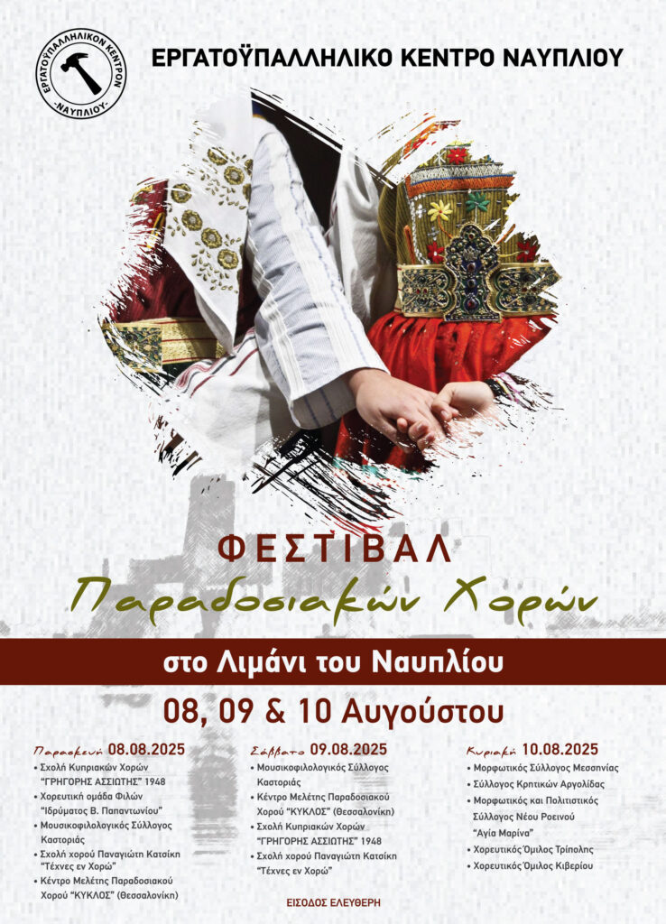 Χωρίς την στήριξη από το Δήμο Ναυπλιέων, θα πραγματοποιηθεί το τριήμερο Φεστιβάλ παραδοσιακών χορών που διοργανώνει το Εργατοϋπαλληλικό Κέντρο Ναυπλίου – Ερμιονίδας, στο Ναύπλιο από 8 έως και 10 Αυγούστου 2025.