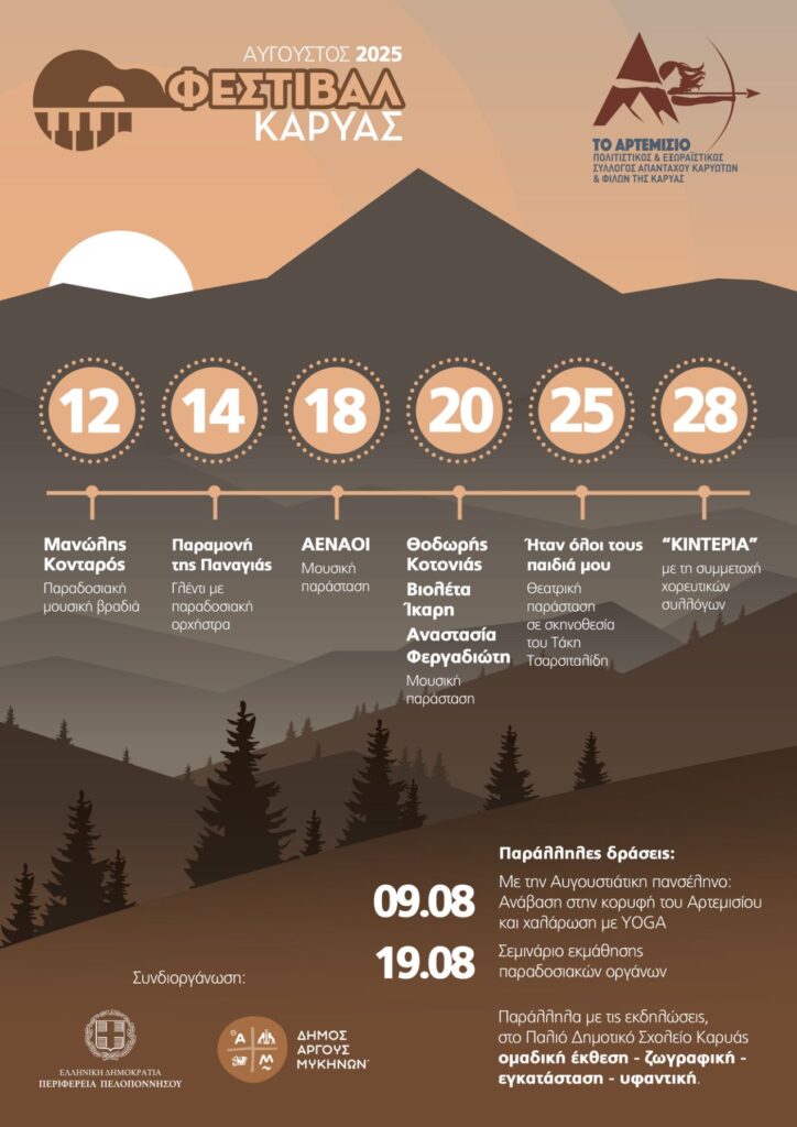 O Πολιτιστικός και Εξωραϊστικός Σύλλογος απανταχού Καρυωτών και φίλων της Καρυάς “Το Αρτεμίσιο” διοργανώνει το Φεστιβάλ Καρυάς 2025, από τις 9 έως τις 28 Αυγούστου, με πλήθος δράσεων και ποικίλο πρόγραμμα.