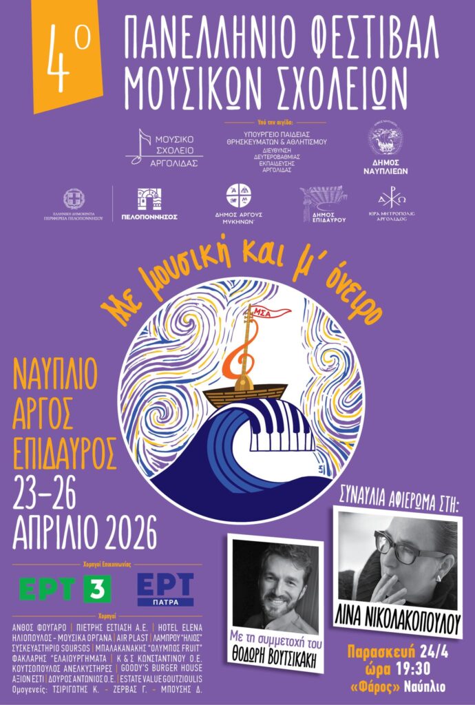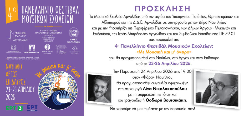 Ο Δήμος Ναυπλιέων ανακοινώνει με ιδιαίτερη χαρά τη διοργάνωση του 4ου Πανελλήνιου Φεστιβάλ Μουσικών Σχολείων με τίτλο «Με μουσική και όνειρο», το οποίο θα πραγματοποιηθεί από τις 23 έως τις 26 Απριλίου 2026.