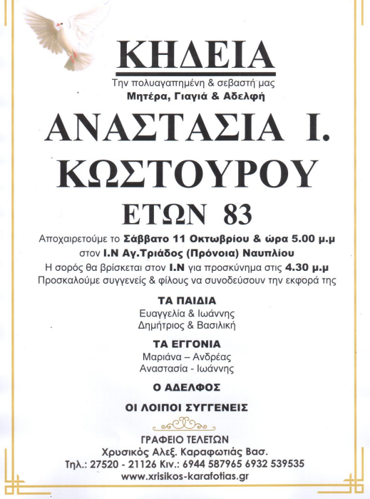 Θα την αποχαιρετήσουμε αύριο Σάββατο στις 5:00μμ στον Ιερό Ναό της Αγίας Τρίαδας Ναυπλίου”.