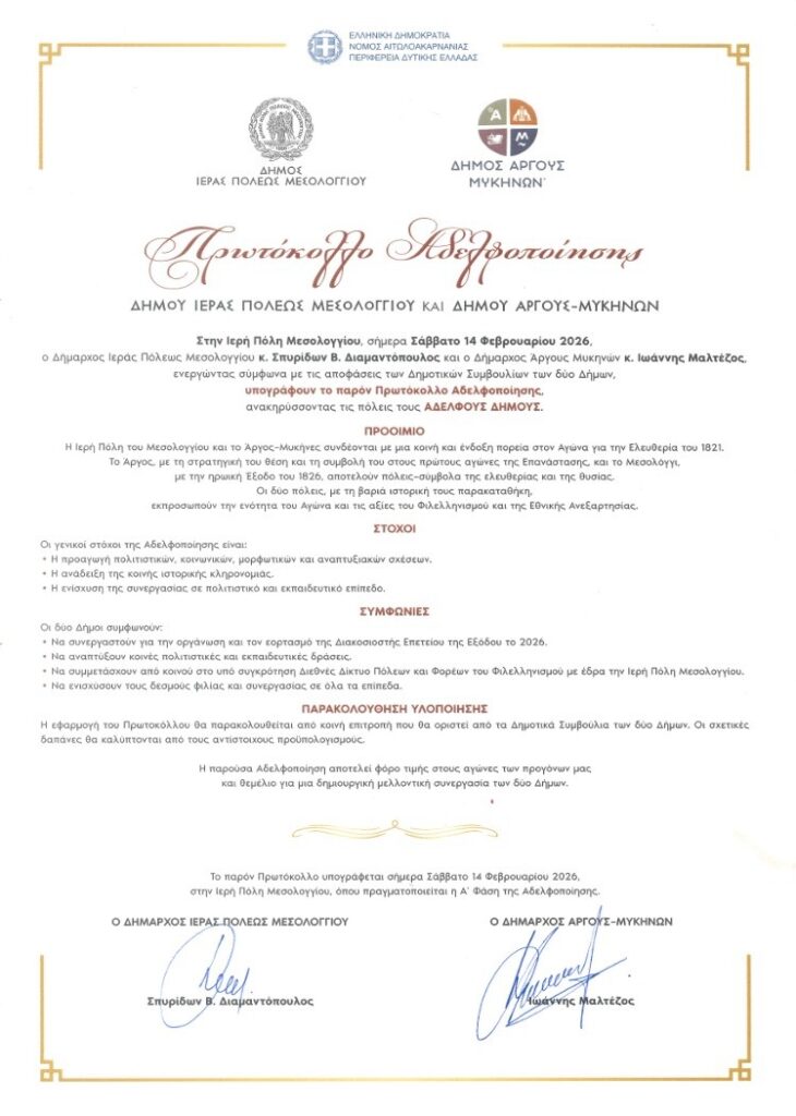 Κατά τη διάρκεια του Συμποσίου υπογράφηκε το πρωτόκολλο αδελφοποίησης μεταξύ του Δήμου Άργους – Μυκηνών και της Ιεράς Πόλεως Μεσολογγίου, επισφραγίζοντας μια σχέση που βασίζεται σε ιστορικούς, πολιτιστικούς και αξιακούς δεσμούς. Η αδελφοποίηση αυτή θέτει τις βάσεις για μελλοντική συνεργασία σε τομείς όπως ο πολιτισμός, η ιστορική μνήμη αλλά και η ανάδειξη της κοινής πολιτιστικής κληρονομιάς.