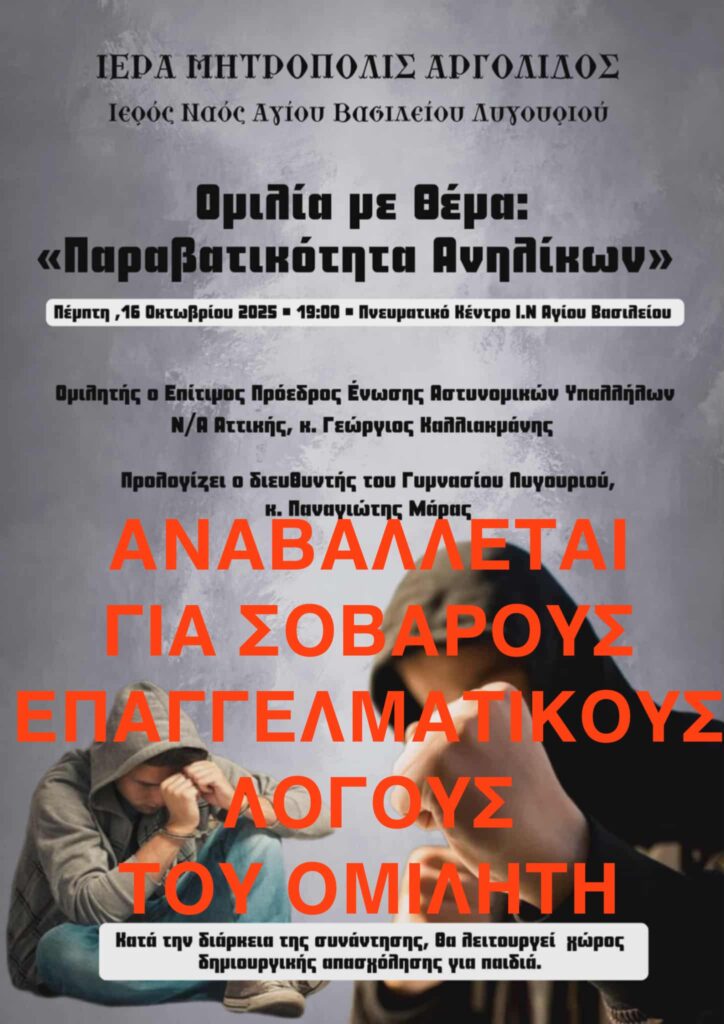 Αναβάλλεται η ομιλία με θέμα την “Παραβατικότητα ανηλίκων” που ήταν προγραμματισμένη για σήμερα, Πέμπτη 16 Οκτωβρίου 2025, στο Πνευματικό Κέντρο Αγίου Βασιλείου στο Λυγουριό, με ομιλητή τον Επίτιμο Πρόεδρο της Ένωσης Αστυνομικών υπαλλήλων Ν/Α Αττικής κ. Γεώργιο Καλλιακμάνη, για σοβαρούς επαγγελματικούς λόγους του ομιλητή.