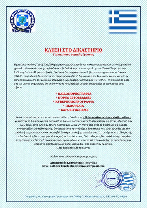 Στο πλαίσιο αυτό ανακοινώνεται ότι, το κείμενο – μήνυμα που διακινείται μέσω ηλεκτρονικού ταχυδρομείου ( email ), ως δήθεν επιστολή του Γενικού Γραμματέα, η οποία φέρει το ονοματεπώνυμό του αλλά με διαφορετική ιδιότητα ή λάθος σύνταξη (Τσουβίλας, Αξιωματικός, Έλληνας αστυνομικός υπεύθυνος πολιτικής προστασίας με το Ευρωπαϊκό γραφείο, σε συνεργασία με το Εθνικό Κέντρο για την Ανάλυση Εικόνων Πορνογραφικών CNAIP κ.α.) καθώς και ψευδή υπογραφή και σφραγίδα, είναι καταφανώς ψευδεπίγραφο και απατηλό.