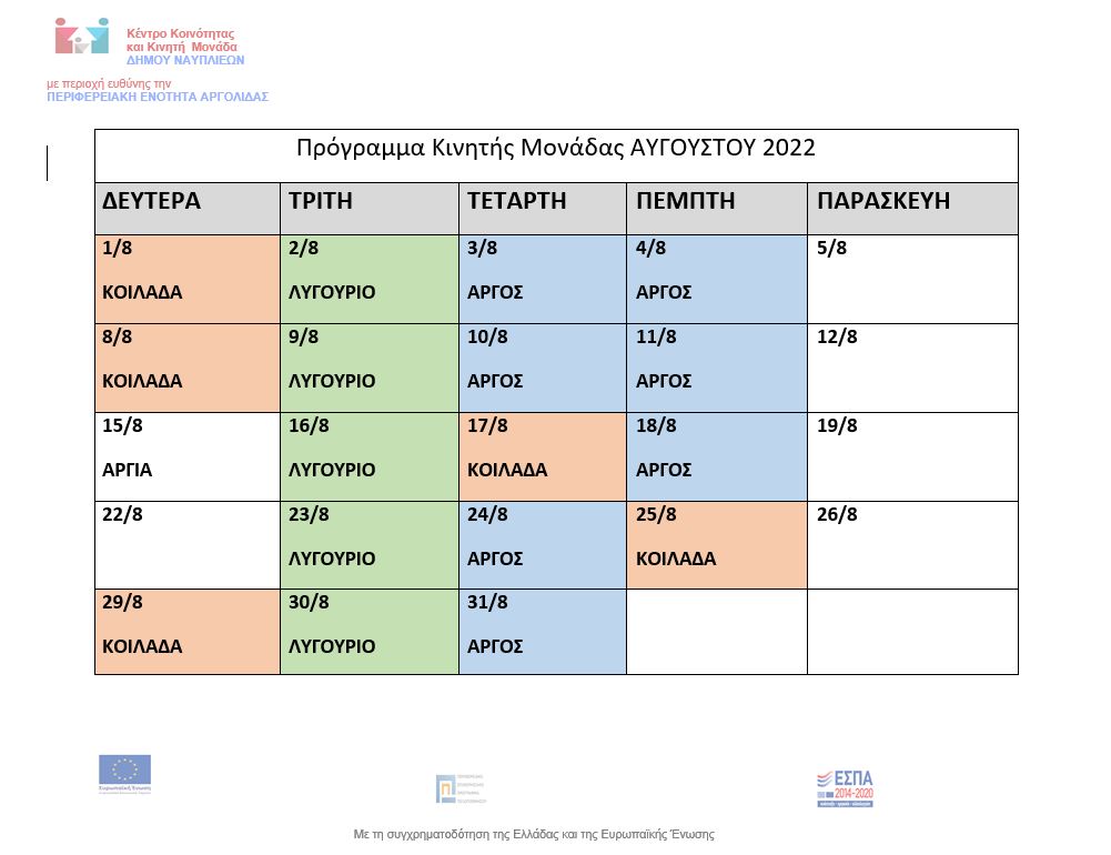 Το Πρόγραμμα της Κινητής Μονάδας για τον Μήνα Αύγουστο 2022: