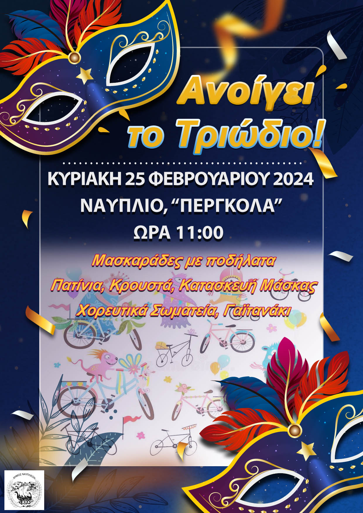 Με μια πολύχρωμη και θορυβώδη πομπή, με μασκαράδες με ποδήλατα και πατίνια αλλά και χορευτικά σωματεία, ανοίγει το Τριώδιο στο Ναύπλιο, την Κυριακή 25 Φεβρουαρίου, στις 11 το πρωί.