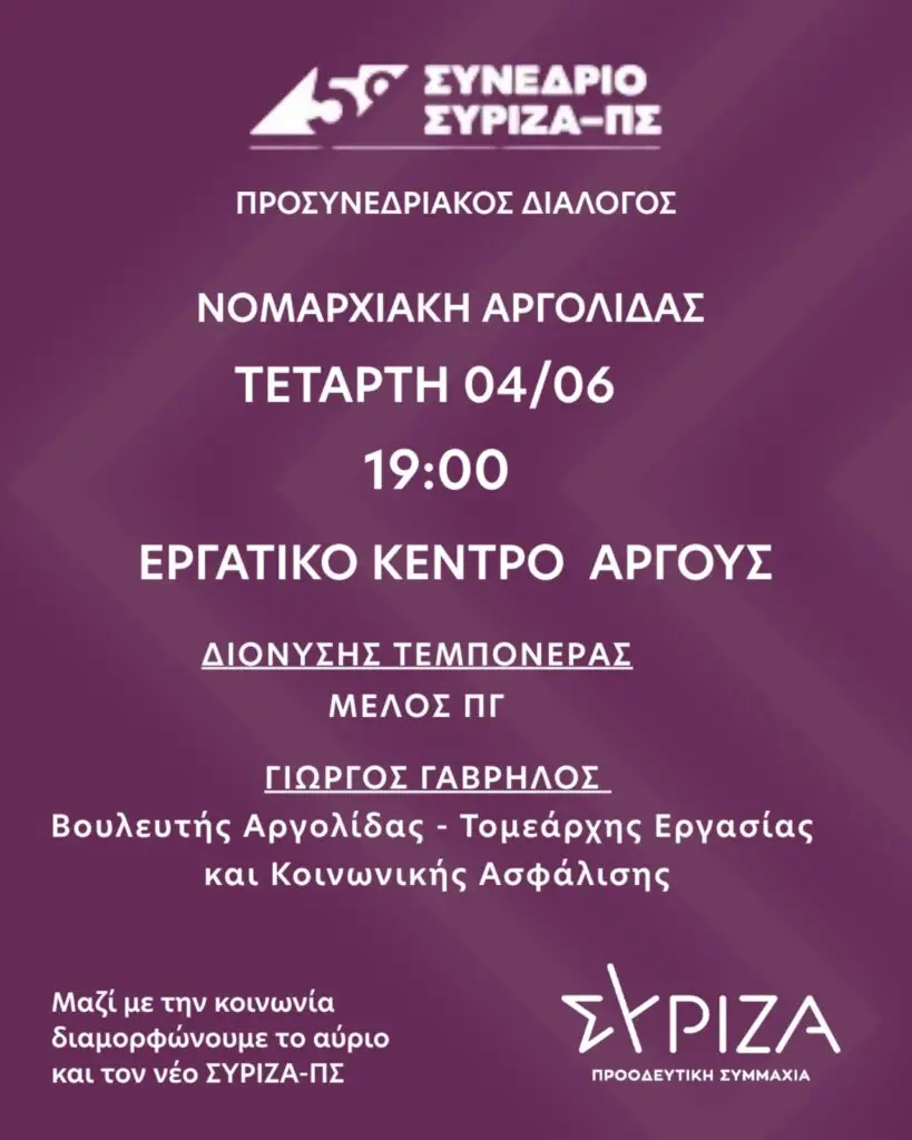 «Στο δρόμο για το συνέδριο του ΣΥΡΙΖΑ που θα γίνει 12-15 Ιουνίου, η Νομαρχιακή Επιτροπή Αργολίδας καλεί τα μέλη και τους φίλους του Κόμματος, την Τετάρτη, 4 Ιουνίου 2025 και ώρα 19.00, στο Εργατικό Κέντρο Άργους στην ανοιχτή εκδήλωση που διοργανώνει με ομιλητές τον Διονύση Τεμπονέρα, Μέλος ΠΓ και τον Γιώργο Γαβρήλο, Βουλευτή Αργολίδας και Τομεάρχη Εργασίας και Κοινωνικής Ασφάλισης.
