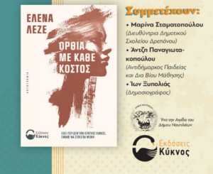 Υπό την αιγίδα του Δήμου Ναυπλιέων, οι Εκδόσεις Κύκνος και η συγγραφέας Έλενα Λεζέ σας προσκαλούν στην παρουσίαση του νέου της βιβλίου με τίτλο «Όρθια με κάθε κόστος», το οποίο αναδεικνύει
