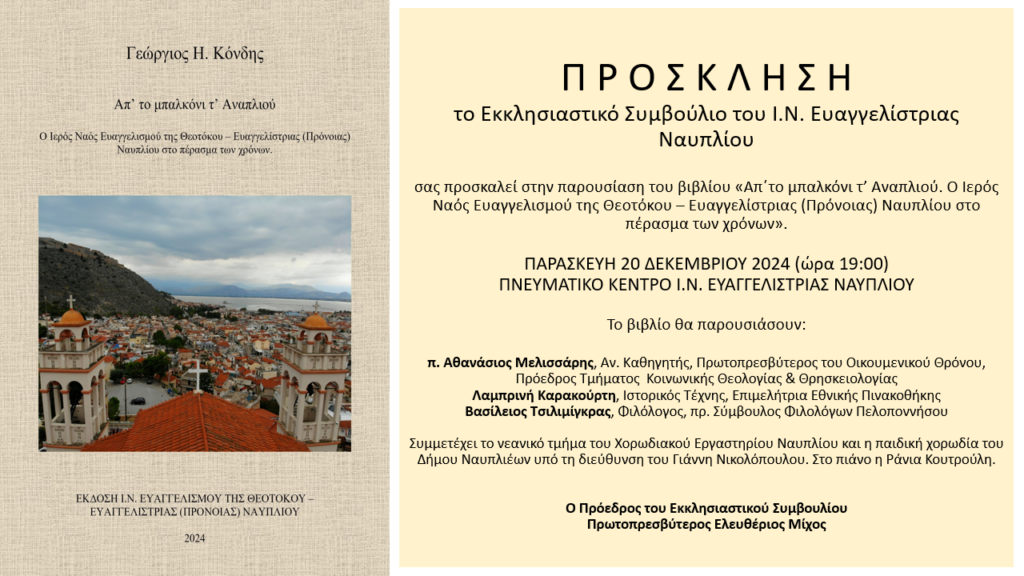 Αποτέλεσμα μιας κοπιαστικής και διεξοδικής έρευνας, το βιβλίο για τον Ι.Ν. Ευαγγελίστριας, το μπαλκόνι τ’ Αναπλιού, απευθύνεται σε όλους του πολίτες που αναζητούν να γνωρίσουν καλύτερα την ιστορία του τόπου τους αλλά και σε εκείνους, εκτός Αργολίδας, οι οποίοι θα ήθελαν να γνωρίσουν την Αργολίδα και τους ιστορικούς της τόπους.