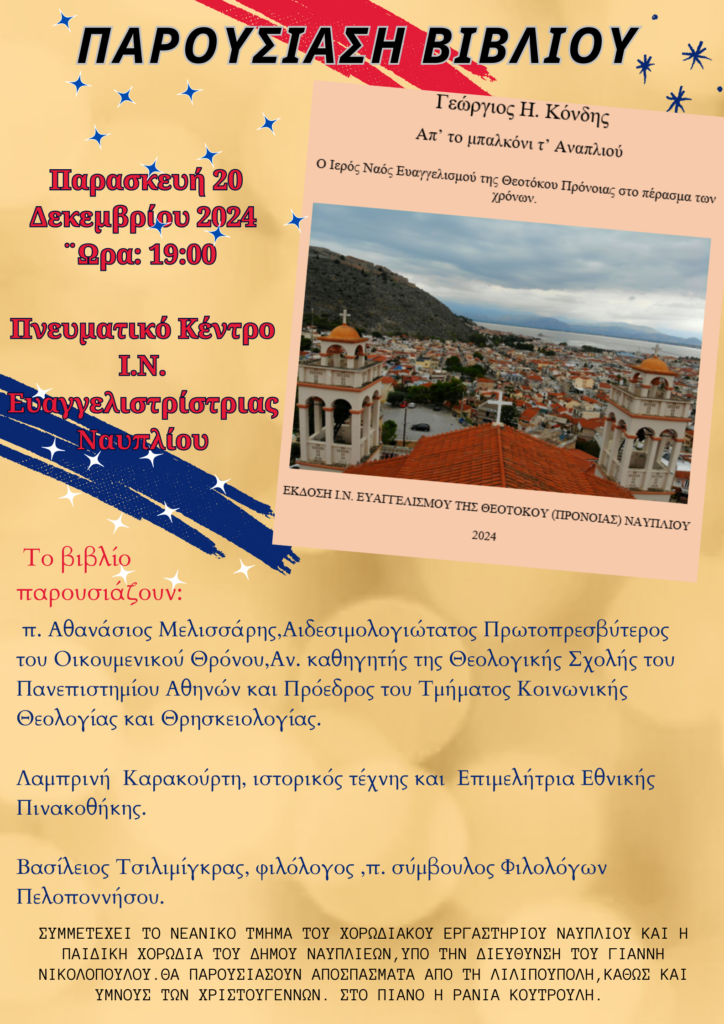 Η έρευνα που παρουσιάζεται στις 20 Δεκεμβρίου 2024 στο Πνευματικό Κέντρο του Ι.Ν. Ευαγγελίστριας Ναυπλίου, αποτελεί μια πρώτη συγκροτημένη προσπάθεια ανάδειξης της αργολικής εκκλησιαστικής ιστορίας ξεκινώντας από έναν χριστιανικό ναό τον οποίο η γεωγραφία και η ιστορία κατέταξαν στους πιο εμβληματικούς της Αργολίδας αλλά και γνωστούς στο Πανελλήνιο χάρη στο μεγάλο προσκύνημα του Ευαγγελισμού και στις υπόλοιπες κοινωνικές του δράσεις.