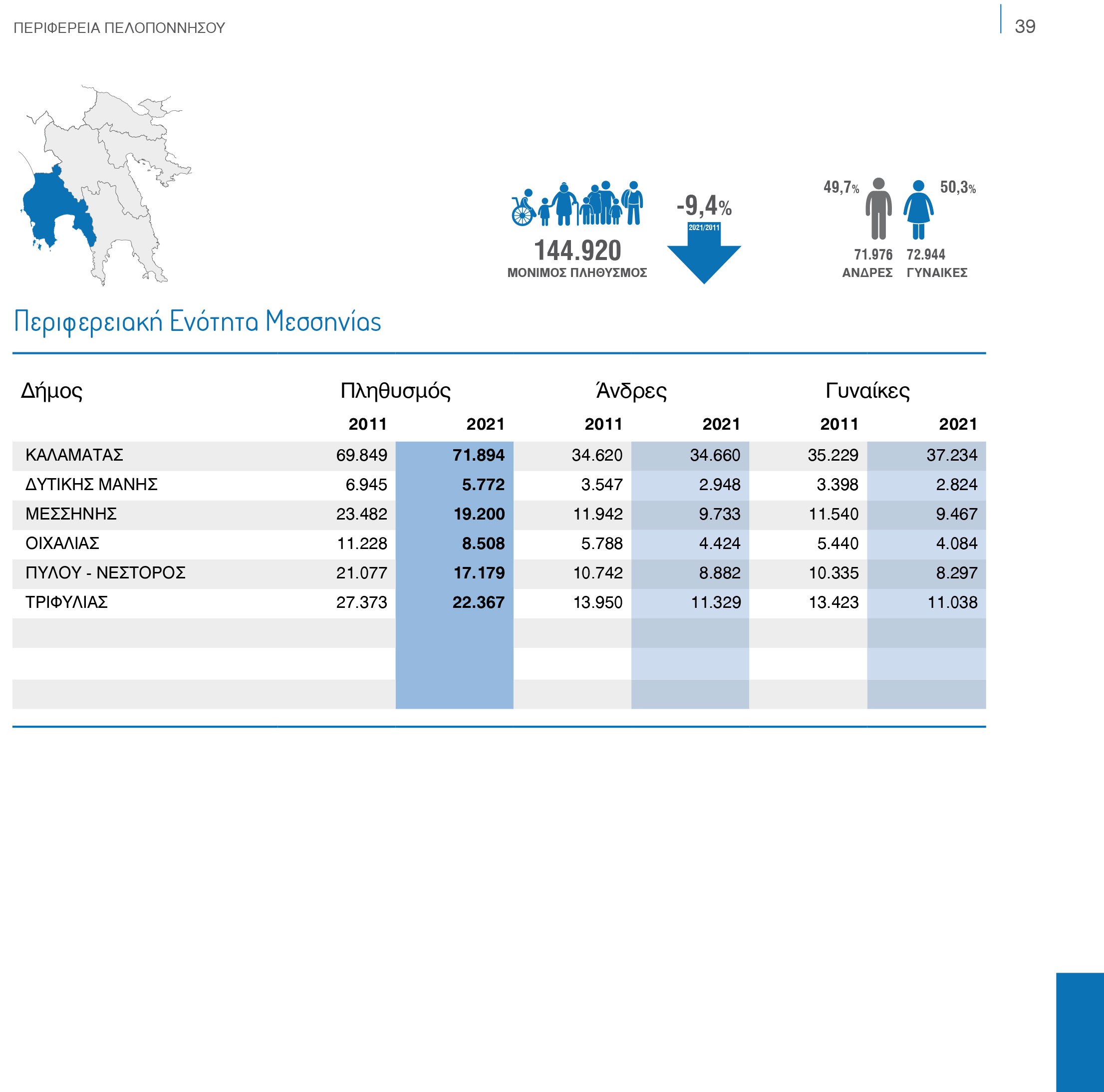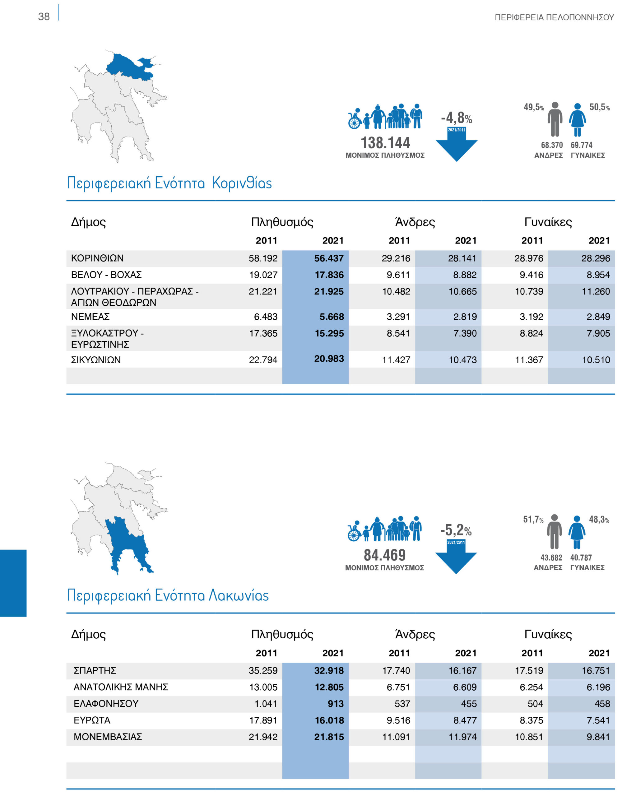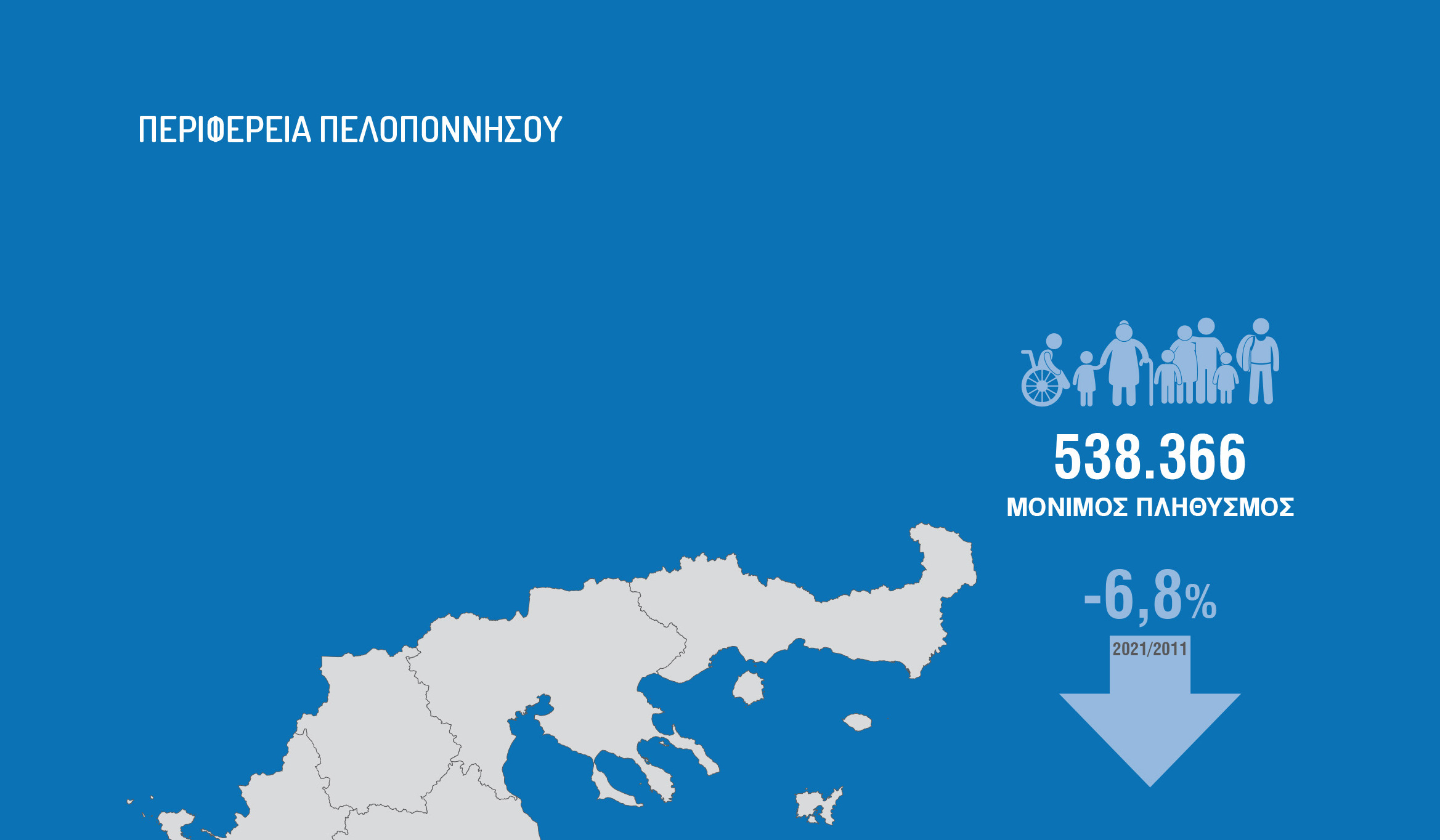 Μείωση πληθυσμού κατά 6,8% καταγράφει η Πελοπόννησος που συνδυάζεται με πληθυσμό 538.366 καταγράφοντας παράλληλα μία αρμονική ισορροπία αφού υπάρχουν 296.285 άνδρες και 269.081 γυναίκες.