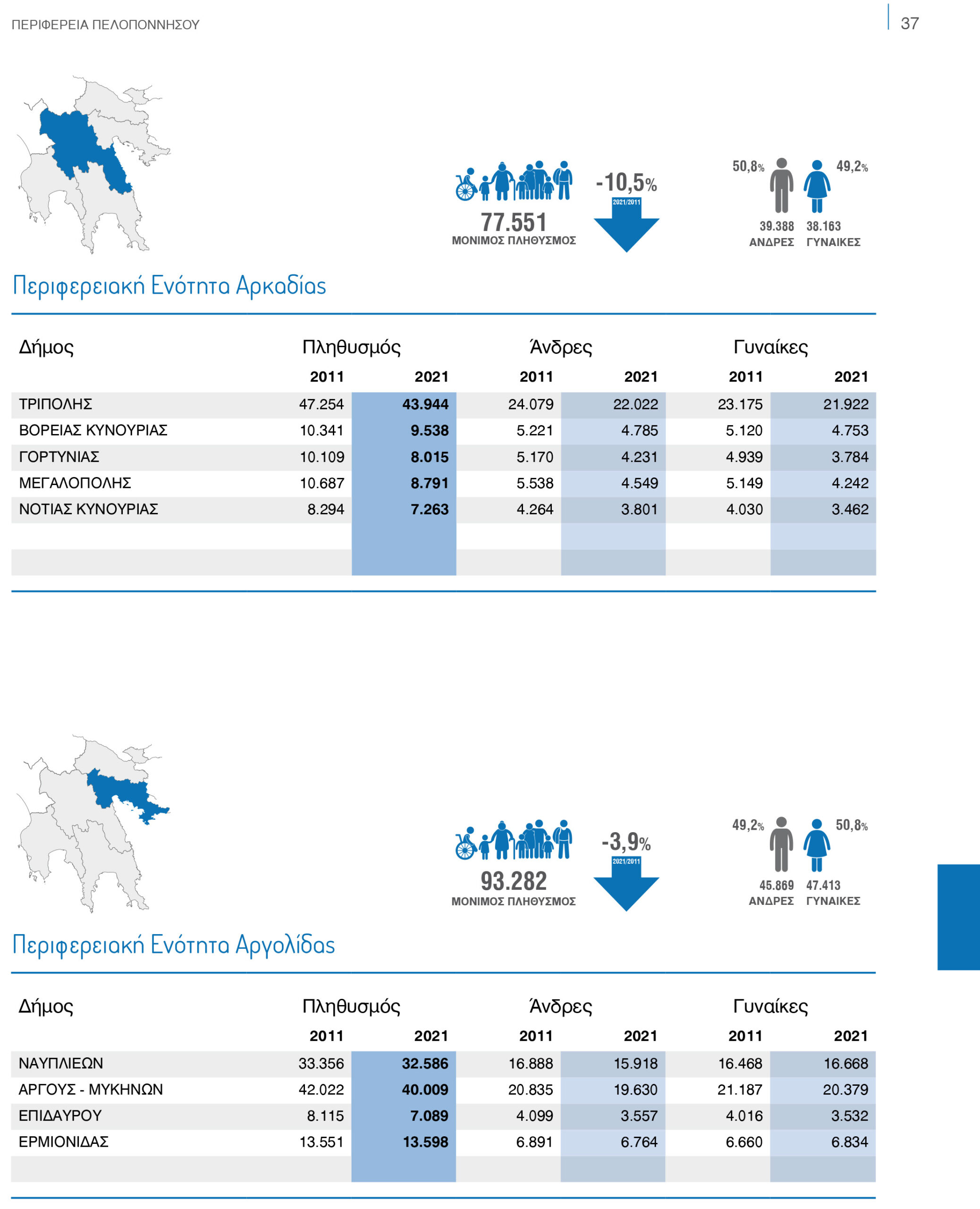 Η μικρότερη μείωση πληθυσμού στην Πελοπόννησο σημειώνεται στην Αργολίδα που έχει 93.282 κατοίκους και η μείωση πληθυσμού –έφθασε το 3,9% την τελευταία δεκαετία. Μία μείωση που κινείται πολύ κοντά στον μέσο όρο που είναι Πανελλαδικά στο 3,5%. Ο ανδρικός πληθυσμός φθάνει τις 45.869 ενώ ο γυναικείος τις 47.413. Η μεγαλύτερη μείωση καταγράφεται στην Αρκαδία με 10,5% και 77.551 κατοίκους και ακολουθεί η Μεσσηνία με 144.920 κατοίκους και ποσοστό μείωσης στο 9,4%. Στην τρίτη θέση βρίσκεται η Λακωνία με πληθυσμό 84.469 και μείωση που φθάνει το 5,2% και η Κορινθία το 4,8% με 138.144 κατοίκους.