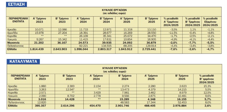 Σε αντίθεση με τη εστίαση ο τζίρος των καταλυμάτων, το Β’ φετινό τρίμηνο σε σχέση με το αντίστοιχο χρονικό διάστημα αυξήθηκε κατά 5,5% στη Αργολίδα, κατά 8% στην Πελοπόννησο και κατά 2,6% στην Ελλάδα. Για το πρώτο τρίμηνο στη Μεσσηνία δεν έχουμε συγκρίσιμα στοιχεία και άρα δεν μπορούμε να εξάγουμε συμπεράσματα για το πρώτο εξάμηνο ούτε για το νομό ούτε για την Περιφέρεια Πελοποννήσου-eleftheriaonline.gr