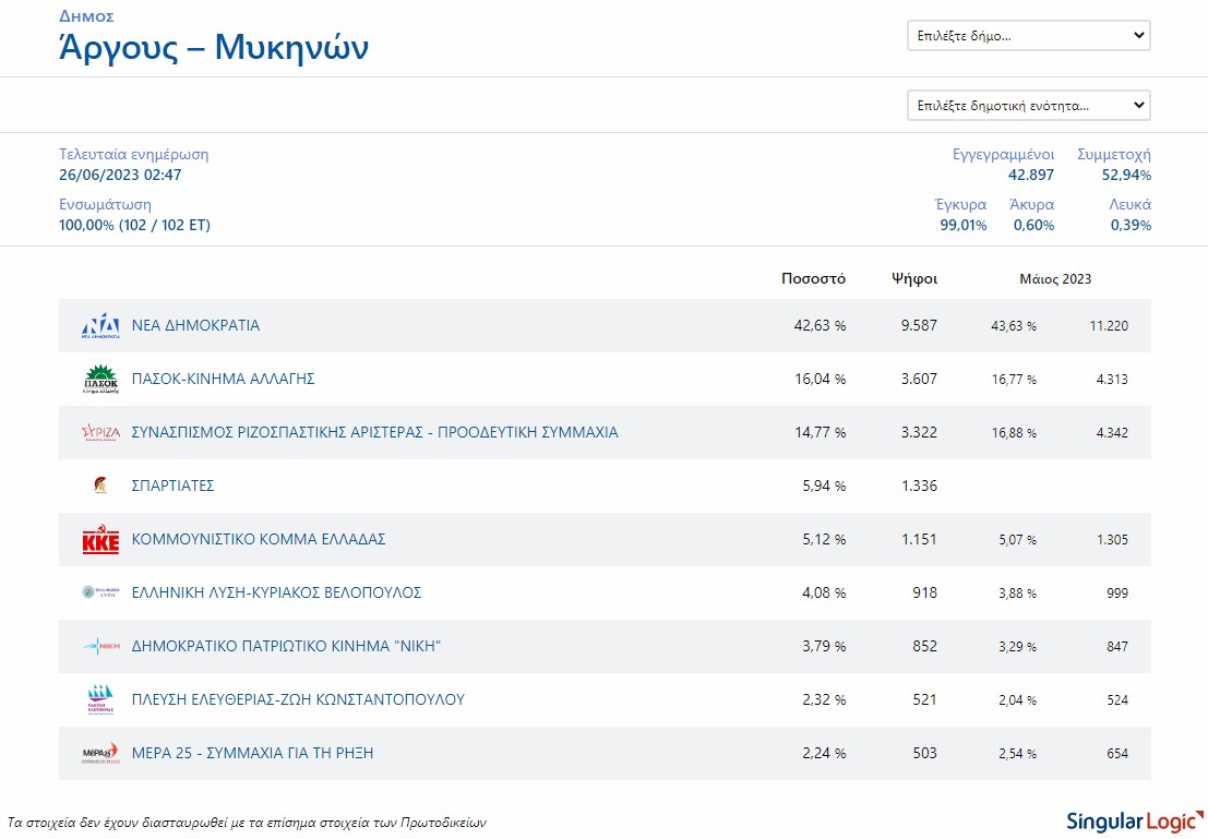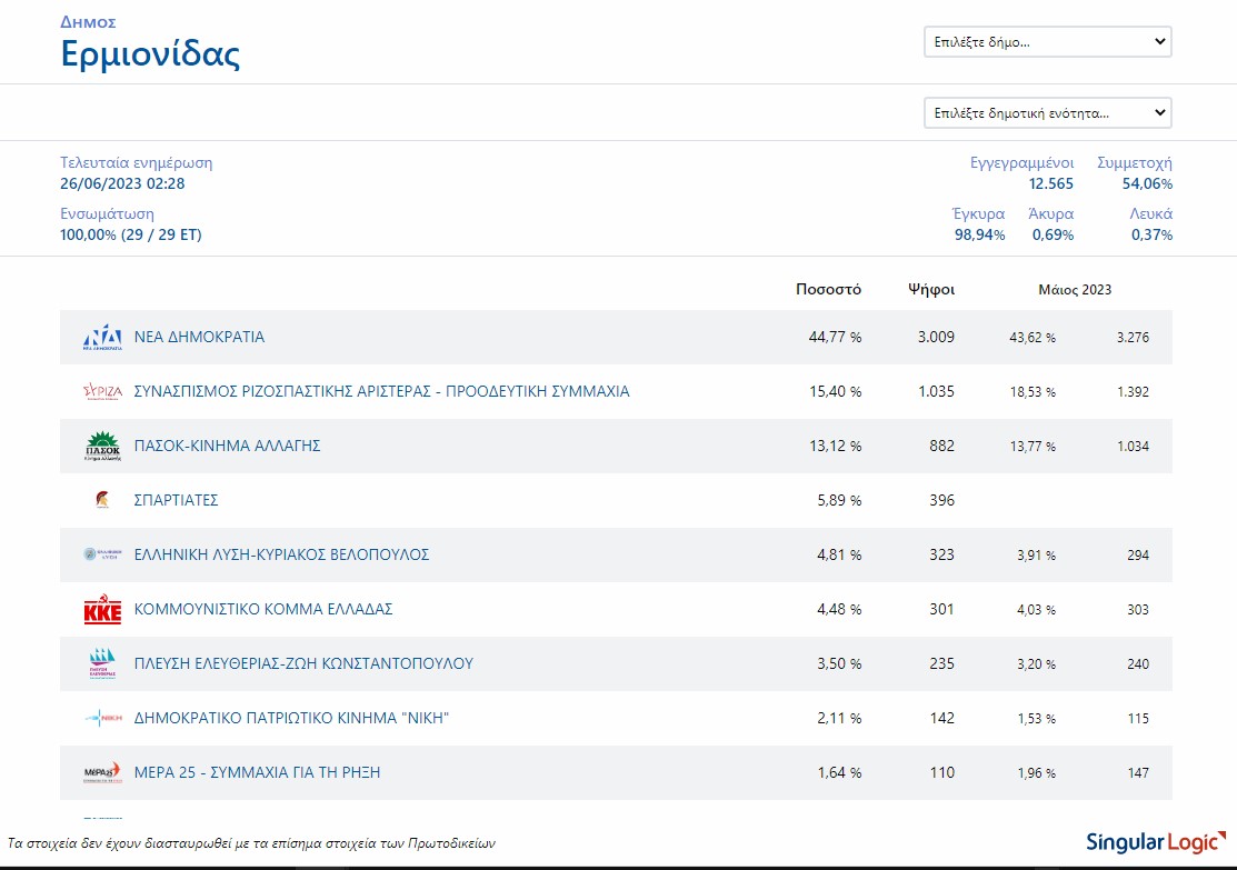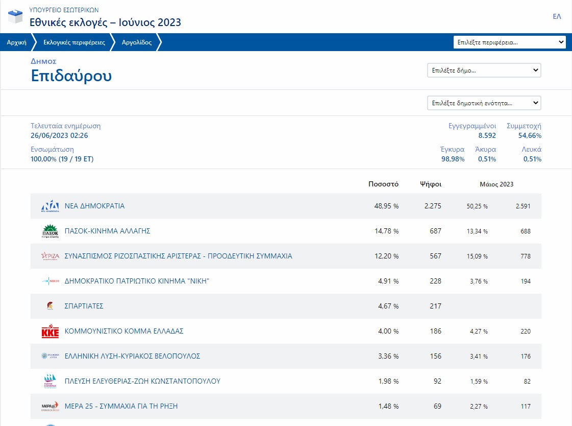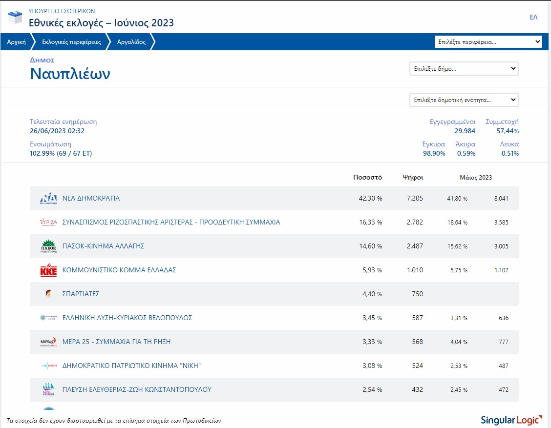 Στον Δήμο Επιδαύρου σημείωσε το μεγαλύτερο ποσοστό της η Νέα Δημοκρατία ενώ ο ΣΥΡΙΖΑ κέρδισε τη δεύτερη θέση στους Δήμους Ναυπλίου και Ερμιονίδας σε αντίθεση με το ΠΑΣΟΚ που βγήκε δυνατό στους Δήμους Αργους και Επιδαύρου. Το μεγαλύτερο ποσοστό συμμετοχής καταγράφηκε στον Δήμο Ναυπλίου με 57,44%. Αναλυτικά τα αποτελέσματα ανα Δήμο είναι τα ακόλουθα: