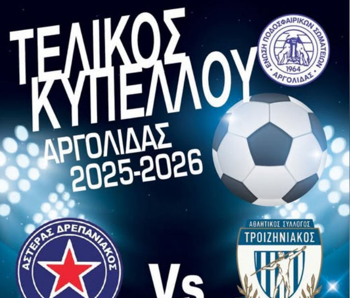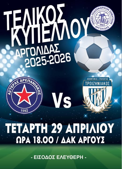 Η Ένωση Ποδοσφαιρικών Σωματείων Αργολίδας, ενόψει της διεξαγωγής του Τελικού Κυπέλλου στο ΔΑΚ Άργους, την Τετάρτη 29 Απριλίου 2026 στις 18:00, μεταξύ των ομάδων του ΑΣΤΕΡΑ ΔΡΕΠΑΝΙΑΚΟΥ & του ΤΡΟΙΖΗΝΙΑΚΟΥ Γ.Σ, ενημερώνει το φίλαθλο κοινό ότι, κατόπιν οδηγιών και αποφάσεων της Αστυνομικής Διεύθυνσης, θα ισχύσουν αυστηρά μέτρα ασφαλείας για την ομαλή και ασφαλή διεξαγωγή του αγώνα.
