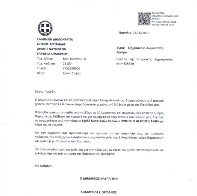 Μάλιστα, ο Δημήτρης Ορφανός προχώρησε ακόμα ένα βήμα παραπάνω καλώντας τον Πρέσβη της Κύπρου στο Ναύπλιο προκειμένου να παρακολουθήσει τις εκδηλώσεις.