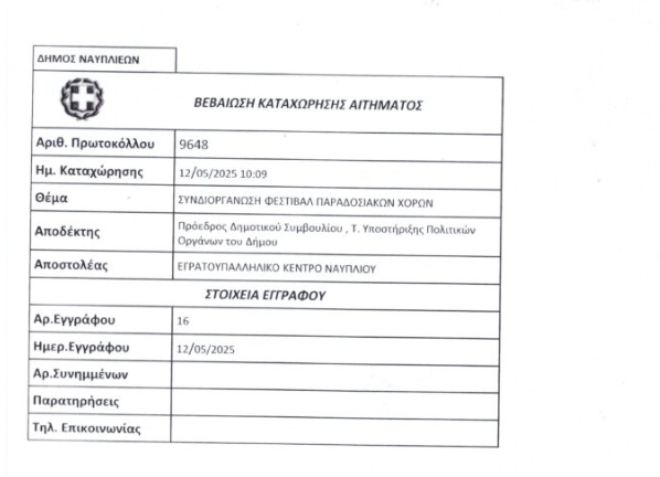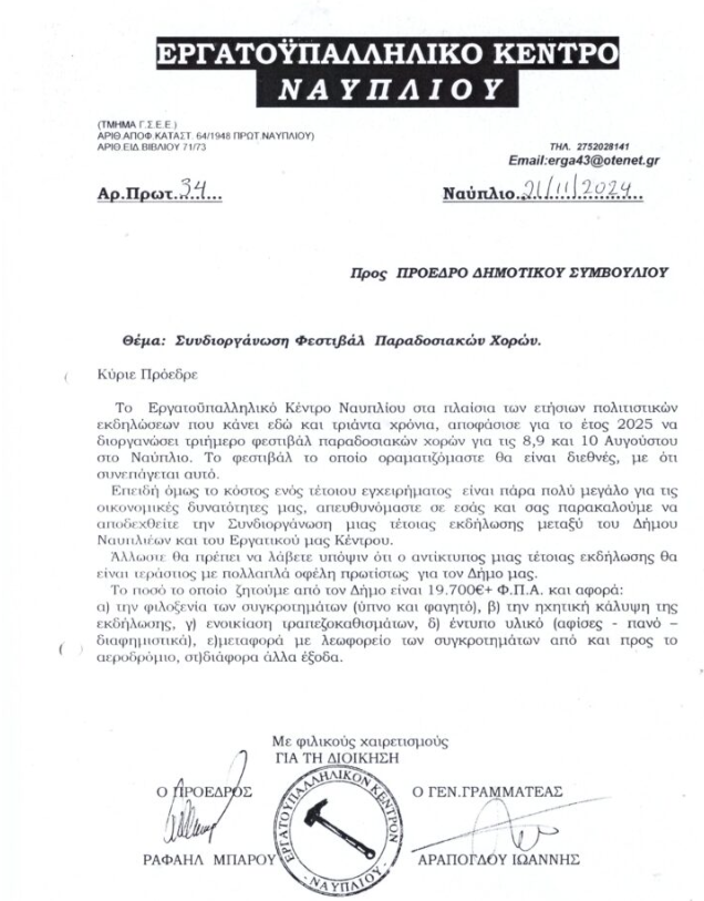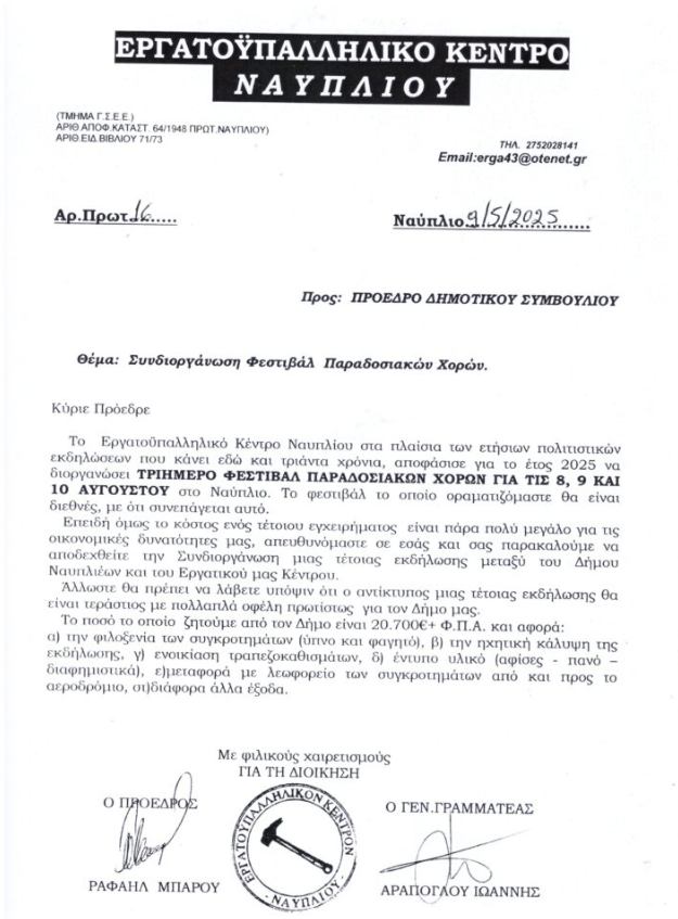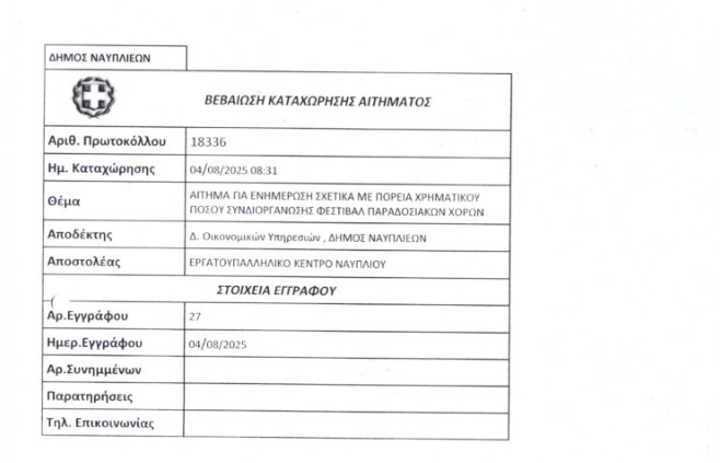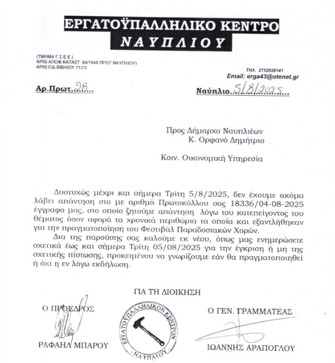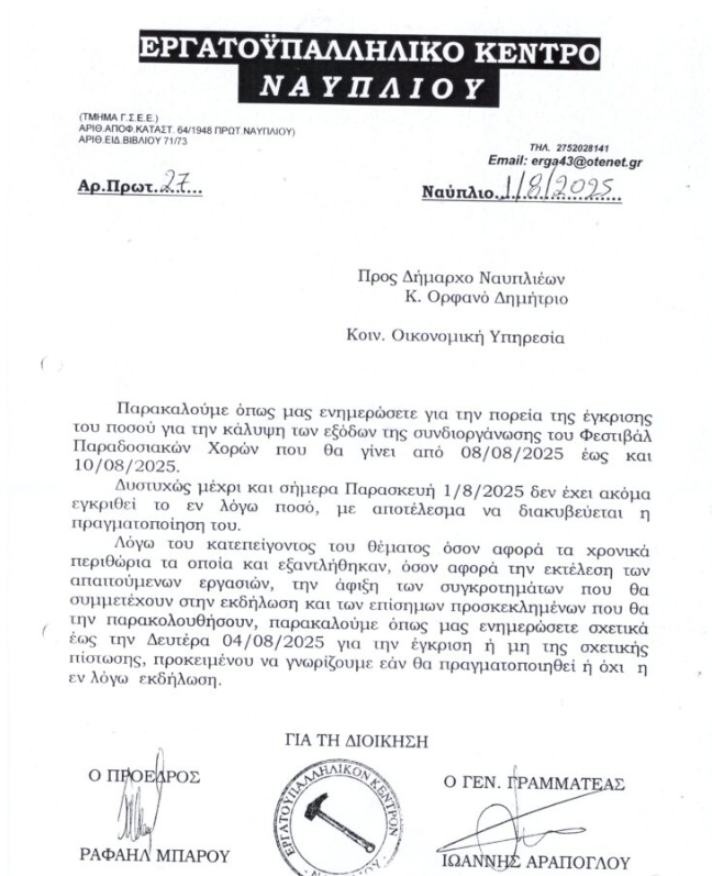 Την απίστευτη ταλαιπωρία που βίωσε στην προσπάθεια της συνδιοργάνωσης με το Δήμο Ναυπλιέων, του Φεστιβάλ Παραδοσιακών Χορών, στο Ναύπλιο, αποκάλυψε σήμερα, κατά την διάρκεια συνέντευξης τύπου, ο Πρόεδρος του Εργατικού Κέντρου Ναυπλίου, Ραφαήλ Μπαρού.