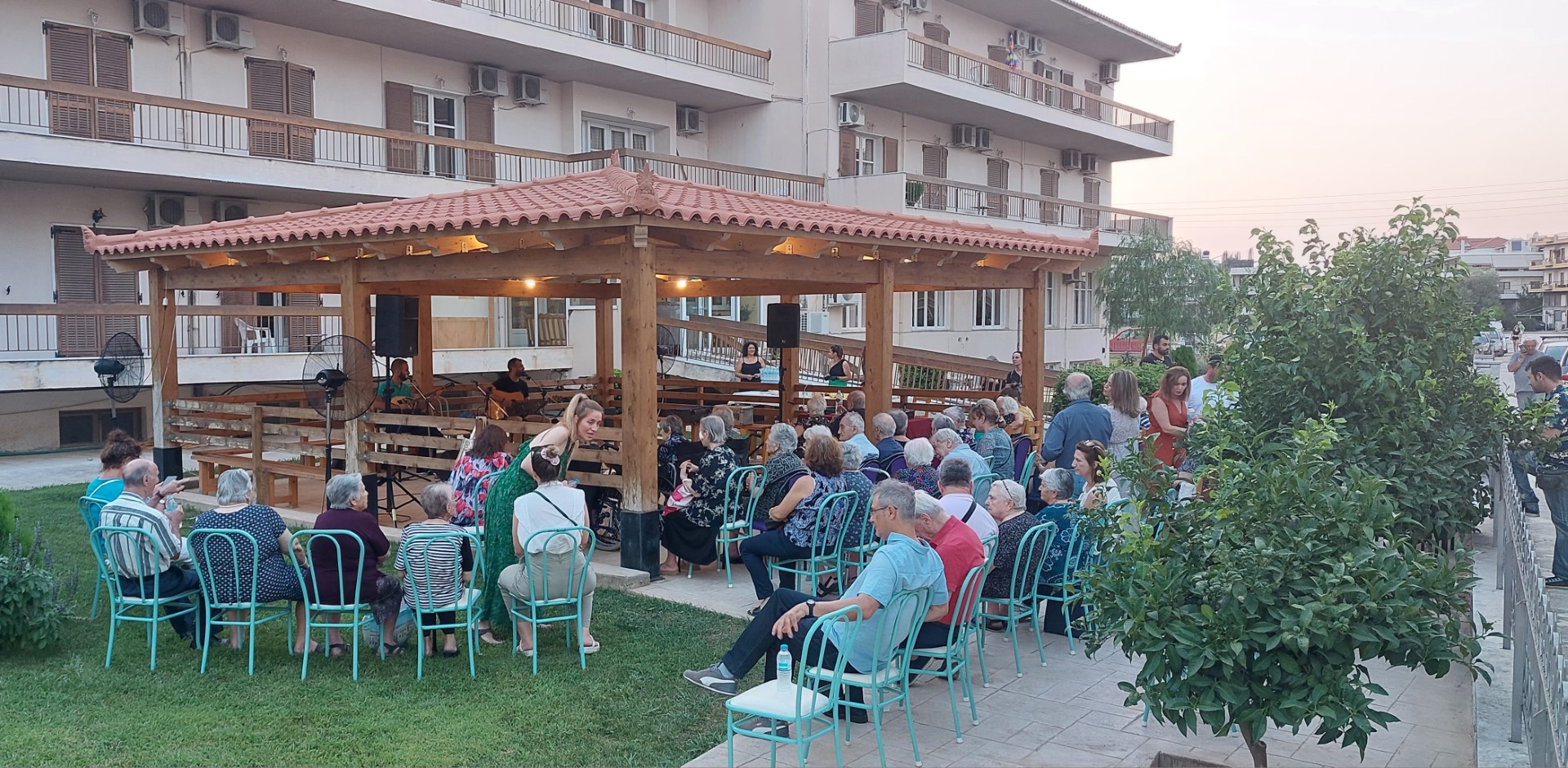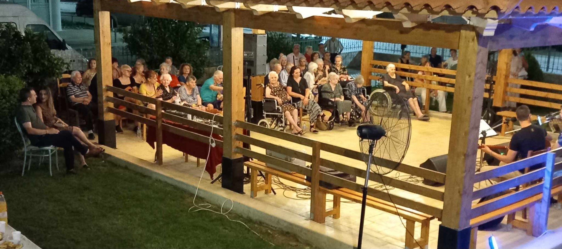 Η ζωντανή εμφάνιση της λαϊκής ορχήστρας στον προαύλιο χώρο του Γηροκομείου, αποτελούμενη από τον Πέτρο Μπουσουλόπουλο (στο τραγούδι), στο μπουζούκι τον Δημήτρη Φασουράκη και στην κιθάρα τον Γιάννη Δεσποτάκη , έδωσε κέφι, καλοκαιρινή διάθεση αλλά και ψυχική ανάταση, κάτι απαραίτητο στους ηλικιωμένους μας! Ερμηνεύοντας τραγούδια σπουδαίων μουσικών, κατάφεραν να μας ταξιδέψουν σ’ εκείνες τις αλλοτινές, απόμακρες εποχές, κάνοντας στάση σε αξέχαστα, αγαπημένα τραγούδια που έβαλαν τη σφραγίδα τους στο καλό ελληνικό τραγούδι!