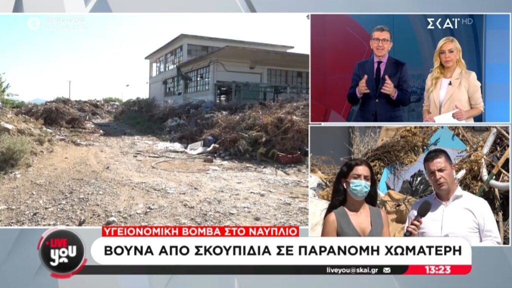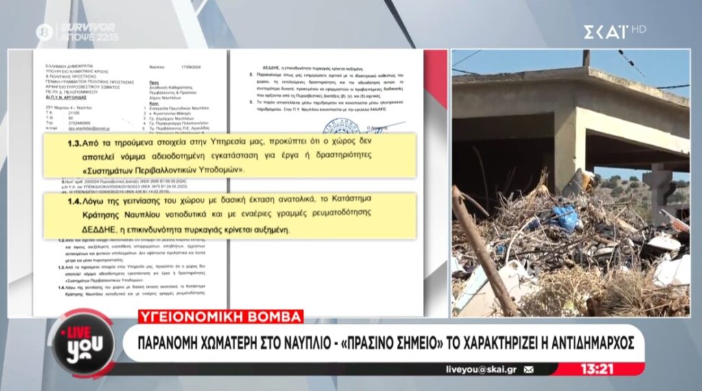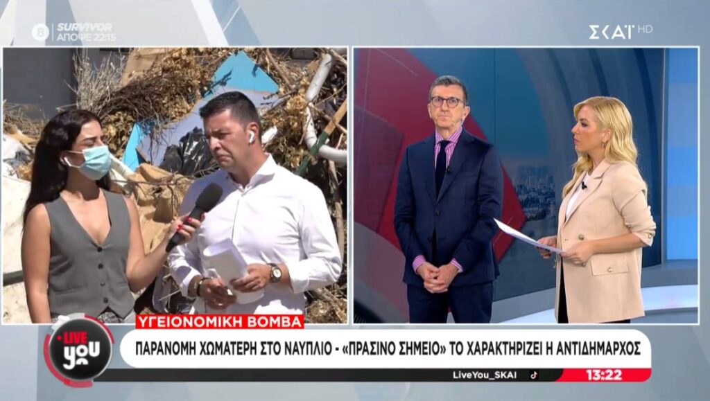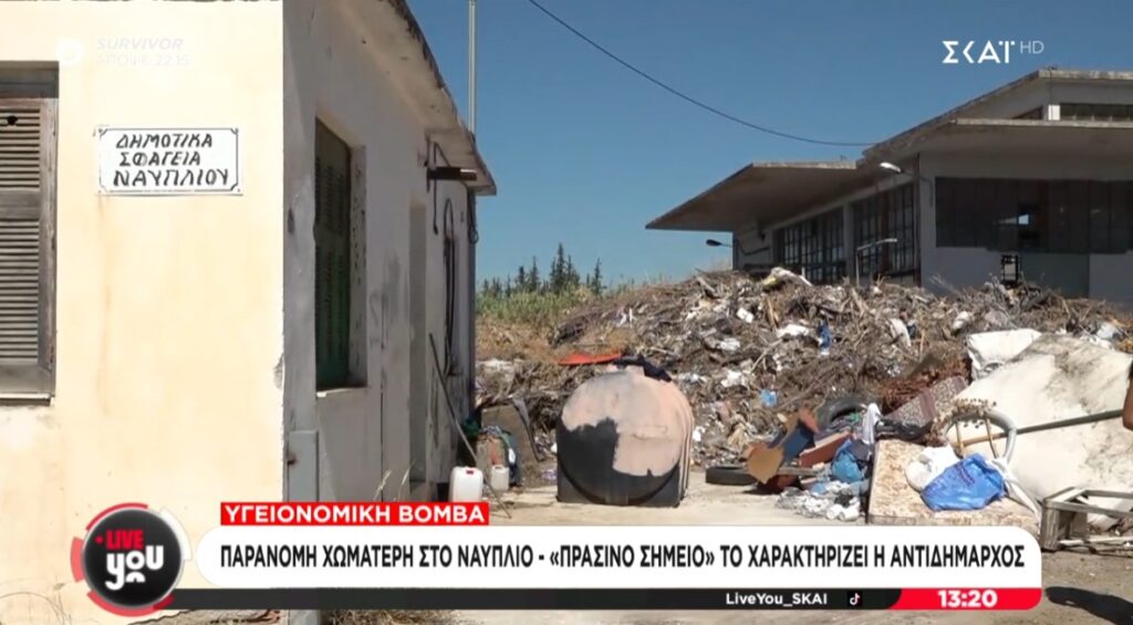 Στον τηλεοπτικό σταθμό ΣΚΑΙ και ειδικότερα στην εκπομπή LIVE YOU, με τον Άρη Πορτοσάλτε και την Μαρία Αναστασοπούλου αναδείχθηκε το πρόβλημα με τα σκουπίδια στο Ναύπλιο και την εναπόθεσή τους σε χώρο που βρίσκεται πίσω από τις φυλακές Ναυπλίου τον οποίο αποκαλούν και «Πράσινο Σημείο» !!! Τα όσα ακούστηκαν στην εκπομπή σίγουρα δεν αποτελούν τιμή για την δημοτική αρχή που οφείλει να ζητήσει δημόσια συγνώμη για το θέαμα του σκουπιδότοπου που αποτελεί δυσφήμιση για το τουριστικό Ναύπλιο.