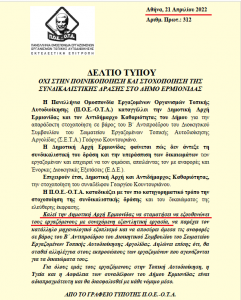 Το Σωματείο Εργαζομένων Τοπικής Αυτοδιοίκησης Αργολίδας (Σ.Ε.Τ.Α.), εντελώς απρόκλητα ανέλαβε μεταξύ άλλων και ρόλο αντιπολίτευσης στον Δήμο Ερμιονίδας, μέσω ενός δελτίου τύπου που εξέδωσε και το υπογράφουν η Πρόεδρός του κ. Τσατσούλη Ευαγγελία και η Γεν. Γραμματέας του κ. Λιάτα Ιουλία.