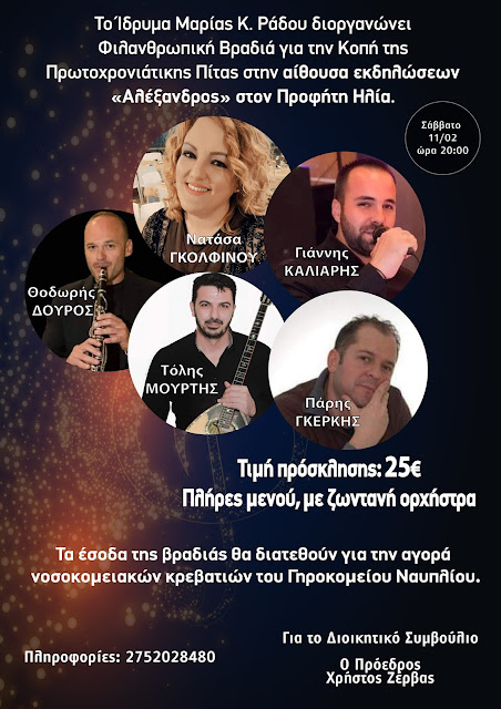 Το Ίδρυμα Μαρίας Κ. Ράδου (Γηροκομείο Ναυπλίου) διοργανώνει το Σάββατο 11 Φεβρουαρίου στις 20:00 Φιλανθρωπική βραδιά για την κοπή της Πρωτοχρονιάτικης πίτας στην αίθουσα εκδηλώσεων “Αλέξανδρος” στον Προφήτη Ηλία.