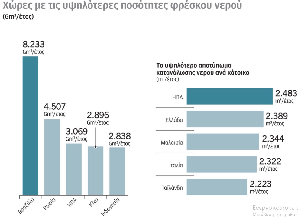 Περισσότεροι από 2,8 δισεκατομμύρια άνθρωποι σε 48 χώρες του κόσμου θα αντιμετωπίσουν σοβαρές ελλείψεις νερού έως το 2025. Μέχρι τα μέσα του αιώνα, μπορεί να φτάσουν ακόμη και τα 7 δισεκατομμύρια. Η Ελλάδα ανήκει στις χώρες με το υψηλότερο αποτύπωμα κατανάλωσης νερού, 2,389 μ3 ανά έτος, αμέσως μετά τις Ηνωμένες Πολιτείες της Αμερικής.
