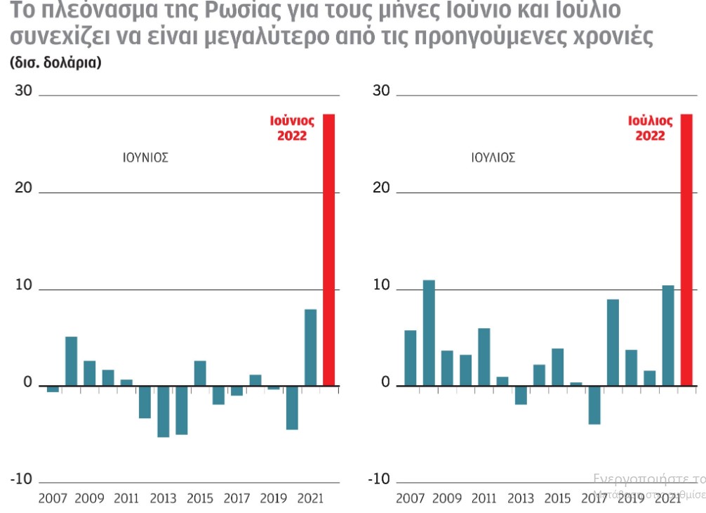 Συνεχίζει να είναι εξαιρετικά αυξημένο το πλεόνασμα της Ρωσίας κατά τους μήνες Ιούνιο και Ιούλιο του 2022 (σχεδόν 28 δισ. δολάρια). Συγκεκριμένα εμφανίζεται υπερτριπλάσιο του αντίστοιχου πλεονάσματος όλων των προηγούμενων ετών. Οι εξωπραγματικές αυξήσεις στις τιμές των καυσίμων στην ουσία εκμηδενίζουν την όποια μείωση των εισαγωγών της Ευρώπης.