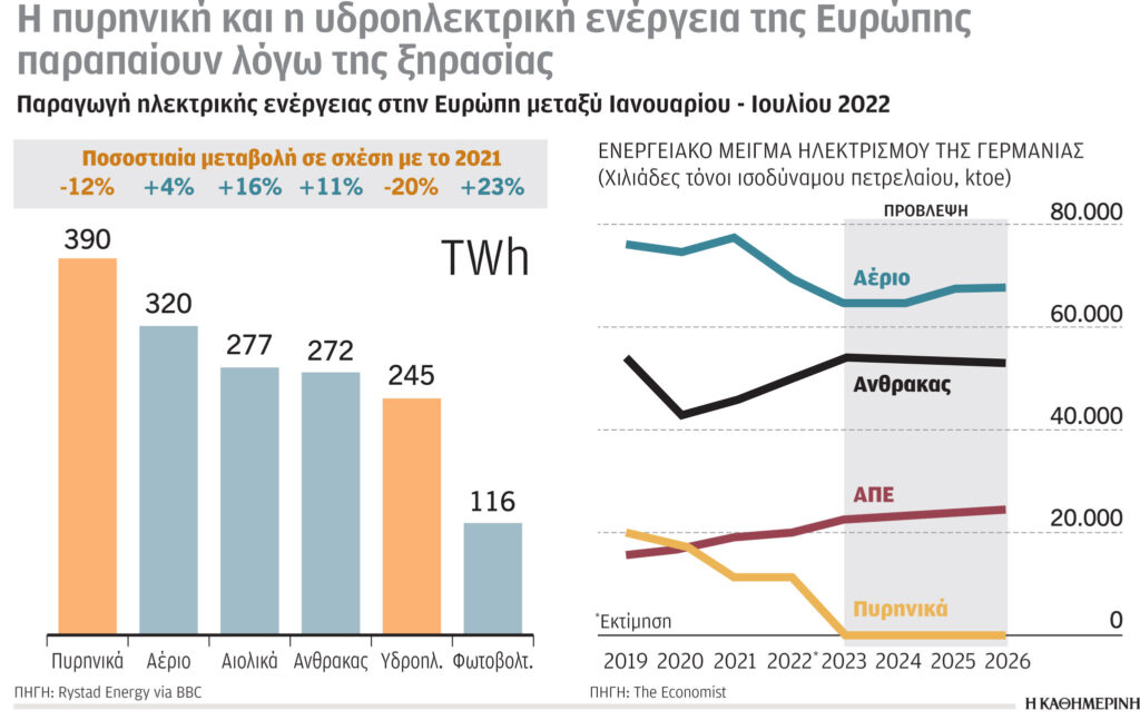 Στα ευρωπαϊκά ενεργειακά παράδοξα της εποχής εμφανίζεται σοβαρή μείωση παραγωγής ηλεκτρισμού στις δύο σημαντικότερες πηγές χαμηλών εκπομπών άνθρακα, στα υδροηλεκτρικά (-20%) και στην πυρηνική ενέργεια (-12%), σε σύγκριση με το 2021. Στο ενεργειακό μείγμα της Γερμανίας προβλέπεται, το 2026, η πρώτη πηγή τροφοδοσίας να είναι το φυσικό αέριο και η δεύτερη ο άνθρακας, με μηδενισμό των πυρηνικών (συζητείται όμως η επέκταση λειτουργίας τους).