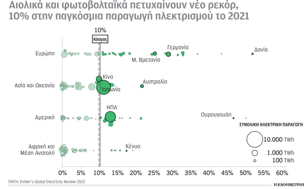 Από τα ελάχιστα ευχάριστα της ενεργειακής συγκυρίας είναι η υπέρβαση του 10% της παγκόσμιας παραγωγής ηλεκτρισμού (σύμφωνα με στοιχεία για το 2021) από το άθροισμα των αιολικών και φωτοβολταϊκών μονάδων. Η Κίνα, οι Ηνωμένες Πολιτείες Αμερικής, η Ιαπωνία και η Γερμανία αποτελούν τις χώρες με τη μεγαλύτερη παραγωγή παγκοσμίως. Στην Ευρώπη ξεχωρίζουν επίσης –αν και πολύ πιο κάτω– η Μεγάλη Βρετανία και η Δανία.