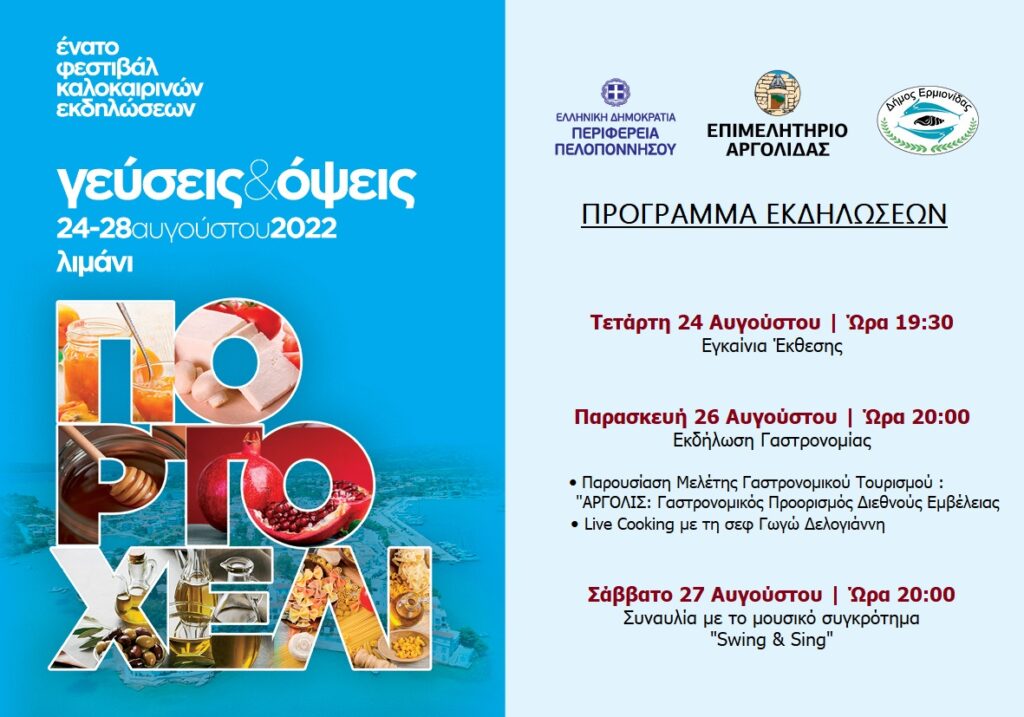 Το βράδυ της Τετάρτης (24/8) έγιναν στο Πορτοχέλι τα εγκαίνια της Έκθεσης «Όψεις και γεύσεις» που διοργανώθηκε από το Επιμελητήριο Αργολίδας, με τη συμμετοχή της Περιφέρειας Πελοποννήσου , του Δήμου Ερμιονίδας και της Κοινότητας Πορτοχελίου.