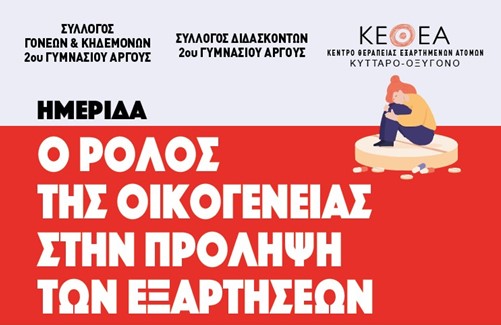 Την Πέμπτη 23 Μαΐου και ώρα 18:00 στην αίθουσα πολλαπλών χρήσεων του 2ου Γυμνασίου Άργους θα πραγματοποιηθεί εκδήλωση, με σκοπό την ενημέρωση αναφορικά με την πρόληψη των εξαρτήσεων αλλά και το ρόλο της οικογένειας σε αυτή.