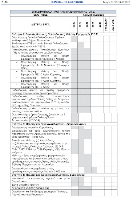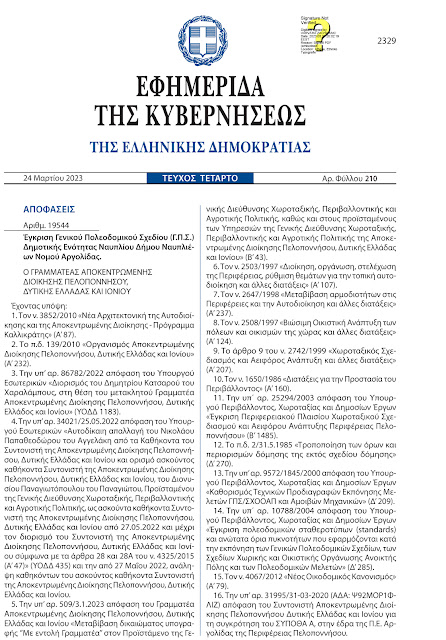 Ο 20ετής κύκλος του σχεδιασμού έκλεισε με τη δημοσίευση του νέου Γ.Π.Σ. Ναυπλίου στο ΦΕΚ 210/ Δ΄/ 24-3-2023 ), κι αυτό ξεκάθαρα κι αποκλειστικά πιστώνεται στο δήμαρχο Δημήτρη Κωστούρο και το δημοτικό συμβούλιο, που παράκαμψαν τα εμπόδια -τρικλοποδιές- υπονομεύσεις ιδιοτελών συμφερόντων και σκοπιμοτήτων, που δεν ήθελαν να ολοκληρωθεί το Γ.Π.Σ. Ναυπλίου. Έκλεισε ο πολυετής κύκλος των απόψεων-προτάσεων, διαβούλευσης, γνωμοδοτήσεων κι έχουμε την οριστική -επιστημονικά τεκμηριωμένη – τελική εγκεκριμένη κατεύθυνση για κάθε στόχο.