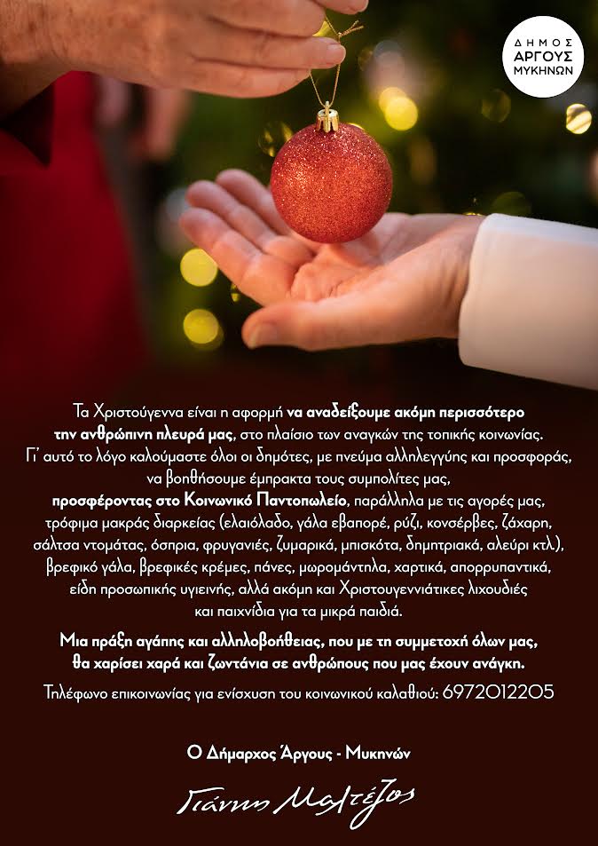 Τα Χριστούγεννα είναι η αφορμή να αναδείξουμε ακόμα περισσότερο την ανθρώπινη πλευρά μας στο πλαίσιο των αναγκών της τοπικής κοινωνίας και γι’ αυτό το λόγο καλούμαστε όλοι οι δημότες με πνεύμα αλληλεγγύης και προσφοράς να βοηθήσουμε έμπρακτα τους συμπολίτες μας προσφέροντας στο Κοινωνικό Παντοπωλείο, παράλληλα με τις αγορές μας τρόφιμα μακράς διαρκείας (ελαιόλαδο, γάλα εβαπορέ, ρύζι, κονσέρβες, ζάχαρη, σάλτσα ντομάτας, όσπρια, φρυγανιές, ζυμαρικά, μπισκότα, δημητριακά, αλεύρι κ.λπ.) βρεφικό γάλα, βρεφικές κρέμες, πάνες, μωρομάντηλα, χαρτικά, απορρυπαντικά, είδη προσωπικής υγιεινής, αλλά ακόμη και Χριστουγεννιάτικες λιχουδιές και παιχνίδια για τα μικρά παιδιά.