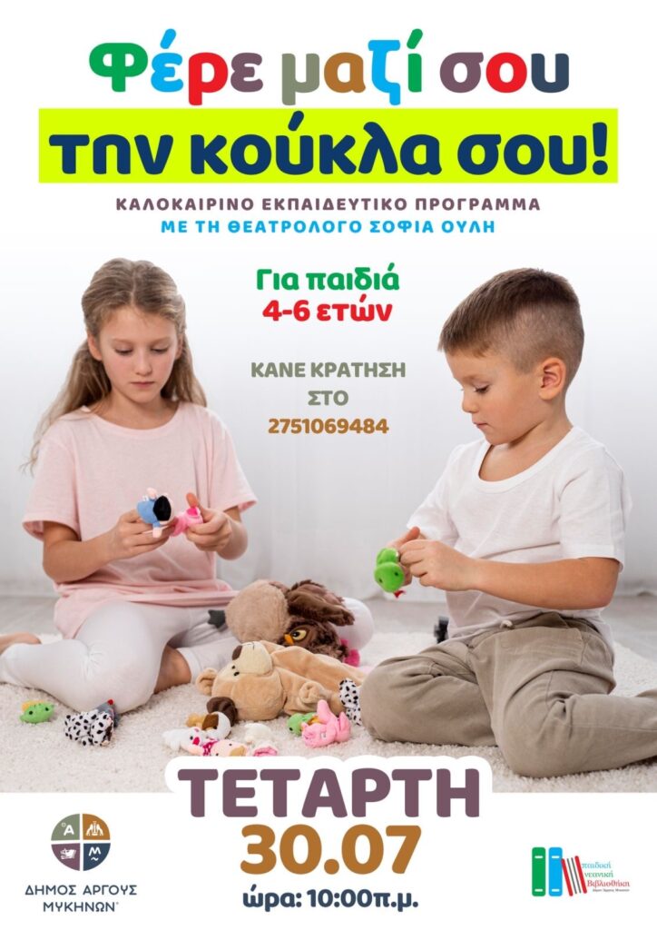 Η Παιδική Νεανική Βιβλιοθήκη του Δήμου Άργους Μυκηνών προσκαλεί τα παιδιά ηλικίας 4 έως 6 ετών, την Τετάρτη 30 Ιουλίου και ώρα 10:00 π.μ, σε ένα δημιουργικό και διασκεδαστικό καλοκαιρινό εκπαιδευτικό πρόγραμμα με τίτλο «Φέρε μαζί σου την κούκλα σου…».
