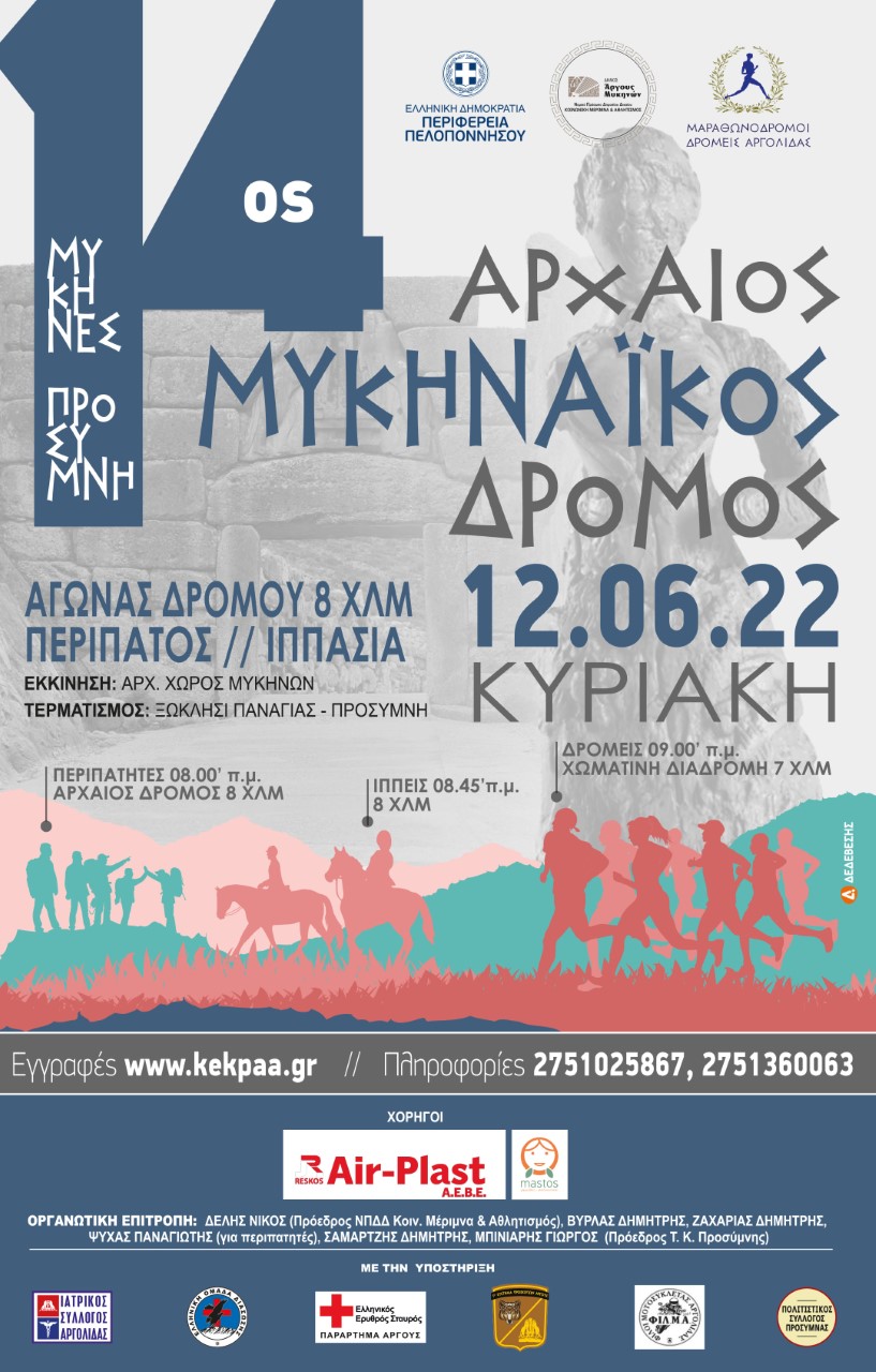Το Ν.Π.Δ.Δ Κοινωνική Μέριμνα και Αθλητισμός Δήμου Άργους – Μυκηνών η Περιφερειακή Ενότητα Αργολίδας, οι Μαραθωνοδρόμοι Δρομείς Αργολίδας, Μέλος της Ε.Ο.Σ.Α.Μ.Α-Υ. ο σύλλογος «οι φίλοι των Μυκηνών και του Μυκηναϊκού Πολιτισμού» και η Τοπική Κοινότητα Προσύμνης συνδιοργανώνουν τον 14ο Αρχαίο Μυκηναϊκό Δρόμο την Κυριακή 12 Ιουνίου 2022, και με τη συμμέτοχη του Πολιτιστικού συλλόγου Προσύμνης.