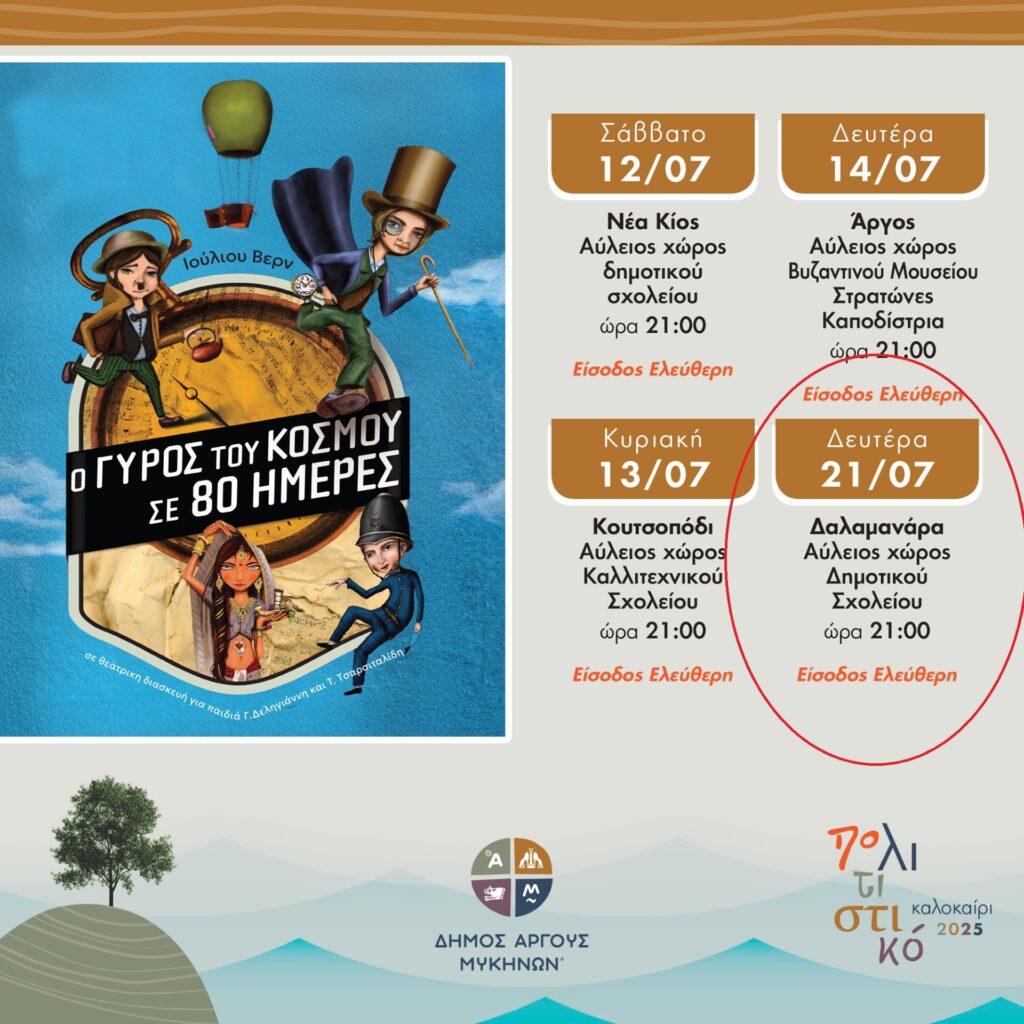 Ο Δήμος Άργους – Μυκηνών προσκαλεί μικρούς και μεγάλους να απολαύσουν σήμερα, Δευτέρα 21 Ιουλίου στις 21:00, την παιδική θεατρική παράσταση «Ο γύρος του κόσμου σε 80 ημέρες», σε διασκευή της δημιουργικής ομάδας «ΘΕΑΤΡΟ ΣΕ ΦΟΡΜΑ».