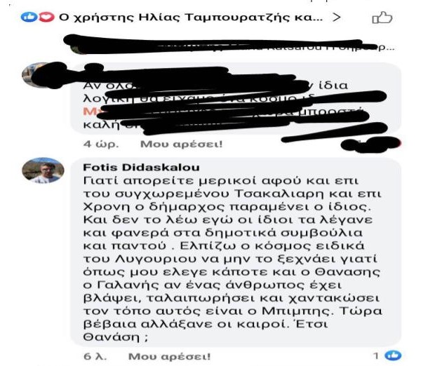 Το μπλοκάρισμα στο facebook του Φώτη Διδασκάλου, Δημοτικού Συμβούλου στο Δήμο Επιδαύρου, στον Θανάση Γαλάνη, όπως αναφέρει ο ίδιος, προκάλεσε την απάντηση του δεύτερου μέσω ανακοίνωσης στην οποία αναφέρονται τα εξής: